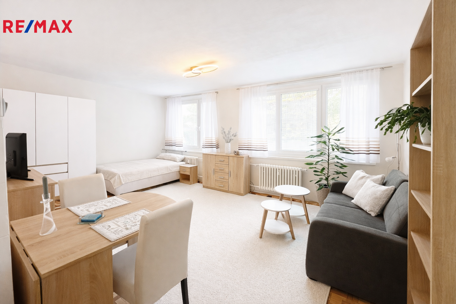 Byt je vybaven nábytkem, což umožňuje okamžité nastěhování bez nutnosti dalších investic. Dispozici tvoří obytný prostor s kuchyňským koutem a koupelna. Praktické uspořádání nabízí pohodlné bydlení pro jednotlivce.