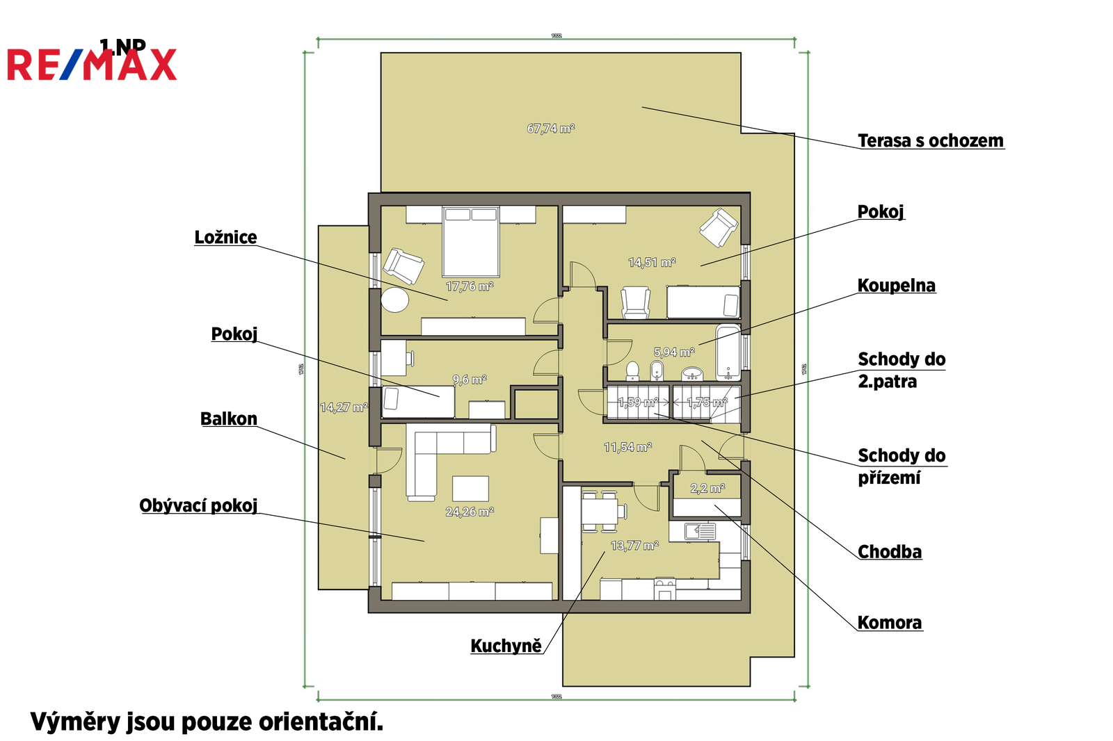 Dům je rozdělen do 3. podlaží, z nichž každé disponuje vlastní kuchyní, přičemž v 1. a 2. patře je k dispozici i samostatná koupelna a sociální zázemí včetně dalších společenských místností. 1. patro zaujme terasou o výměře 68 m2, a balkónem o 14 m2. V přízemí domu jistě oceníte 2 garáže pro bezpečné a pohodlné parkování automobilů. Pro ukládání věcí je k dispozici také půda o výměře 27 m2, nebo prostorný sklep pod domem.