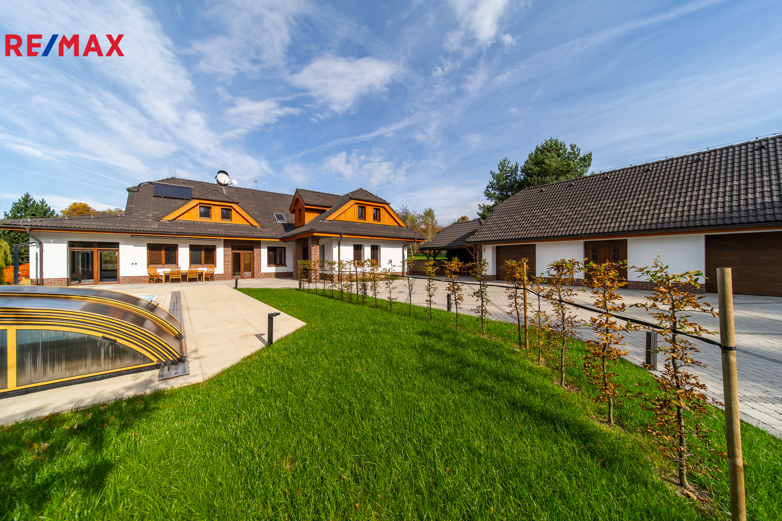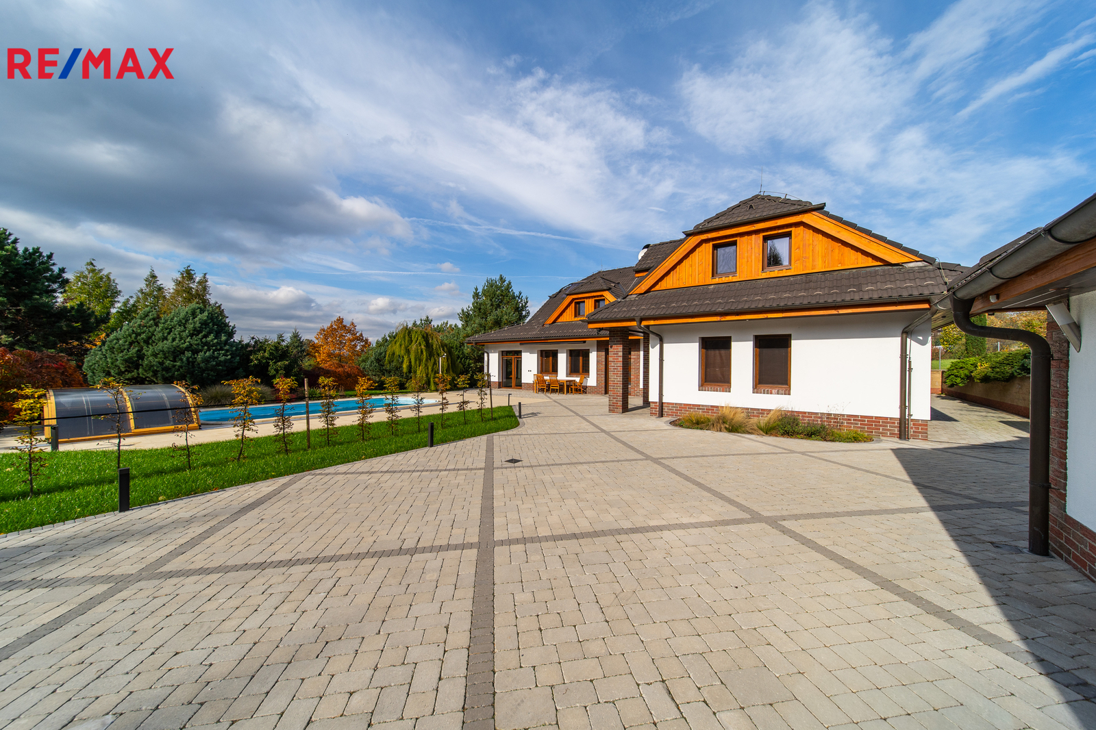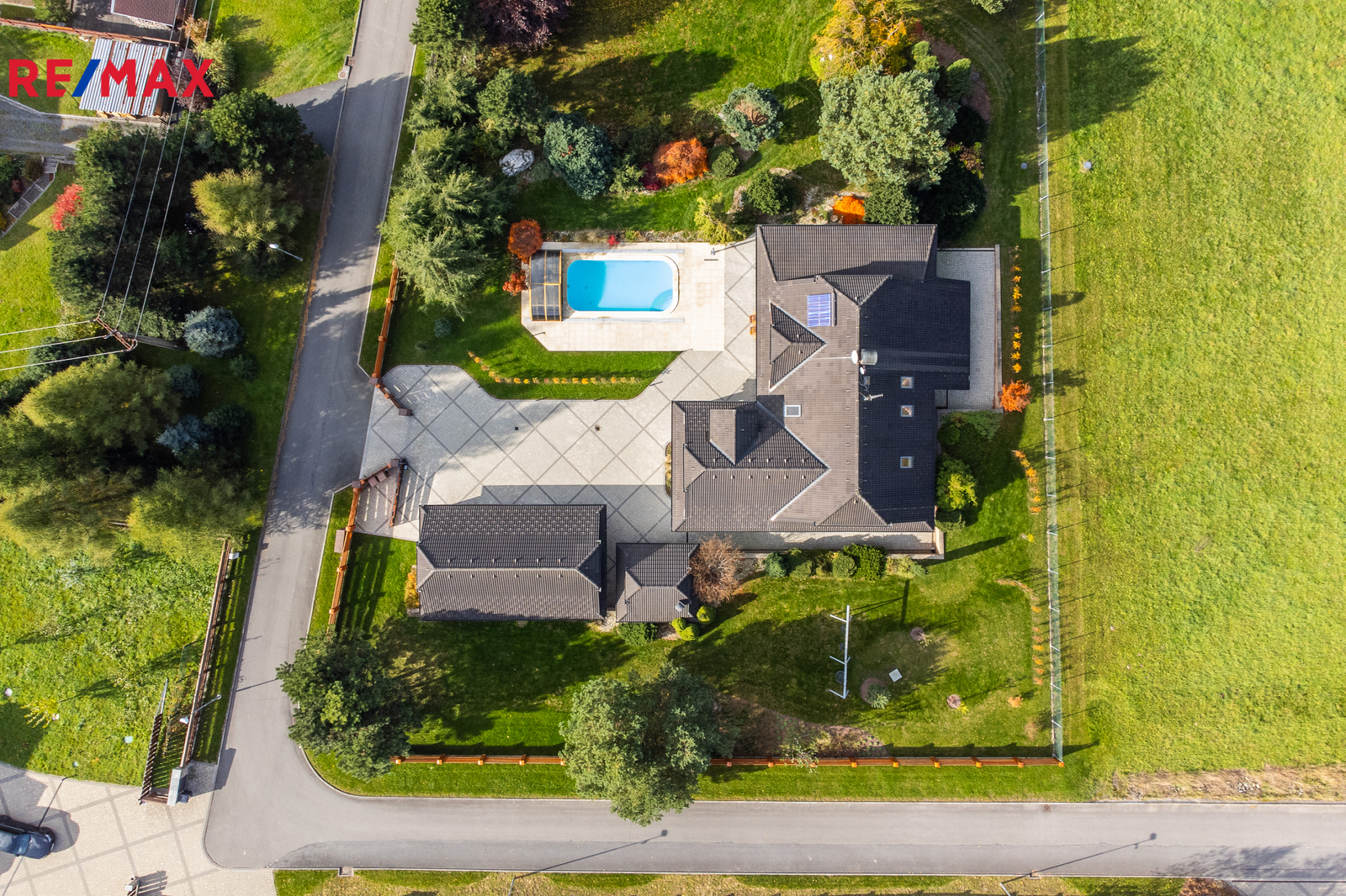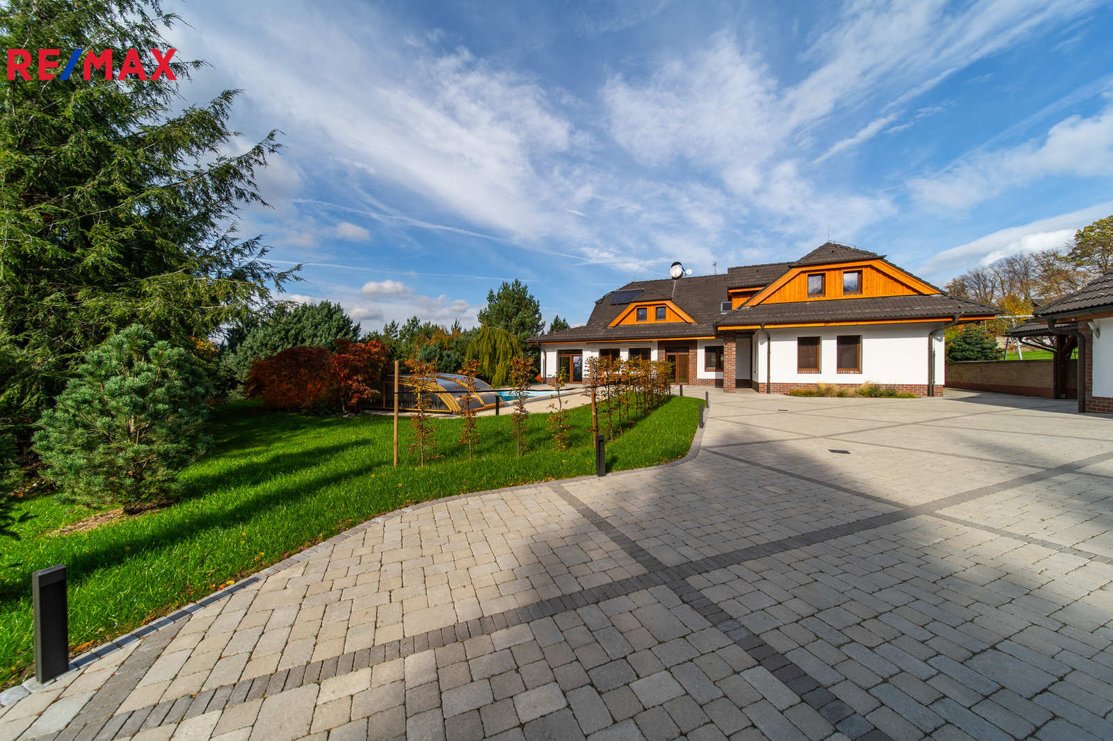 Rozsáhlé zpevněné plochy, terasa a připravený prostor pro bazén podtrhují charakter skutečného rodinného sídla. Pozemek poskytuje soukromí, otevřené výhledy do okolní krajiny a přímý kontakt s přírodou.
