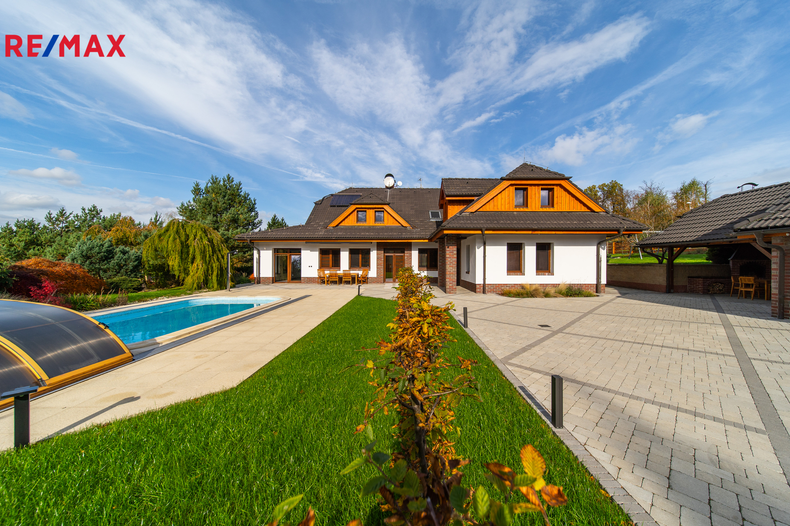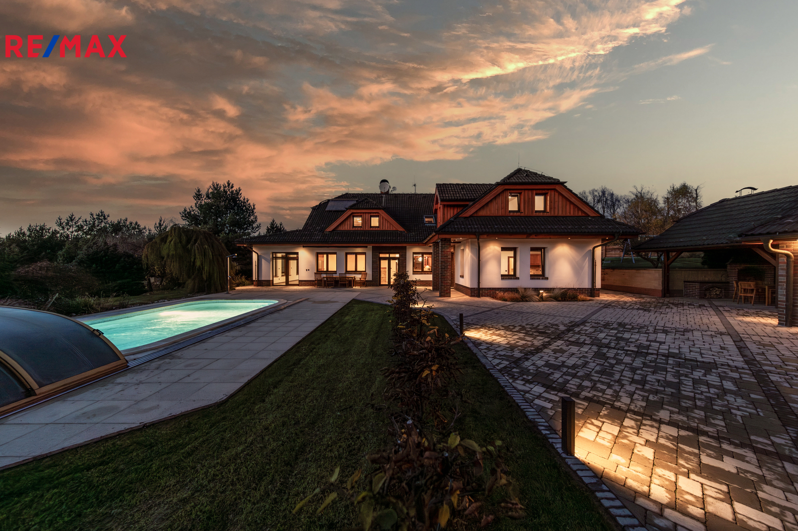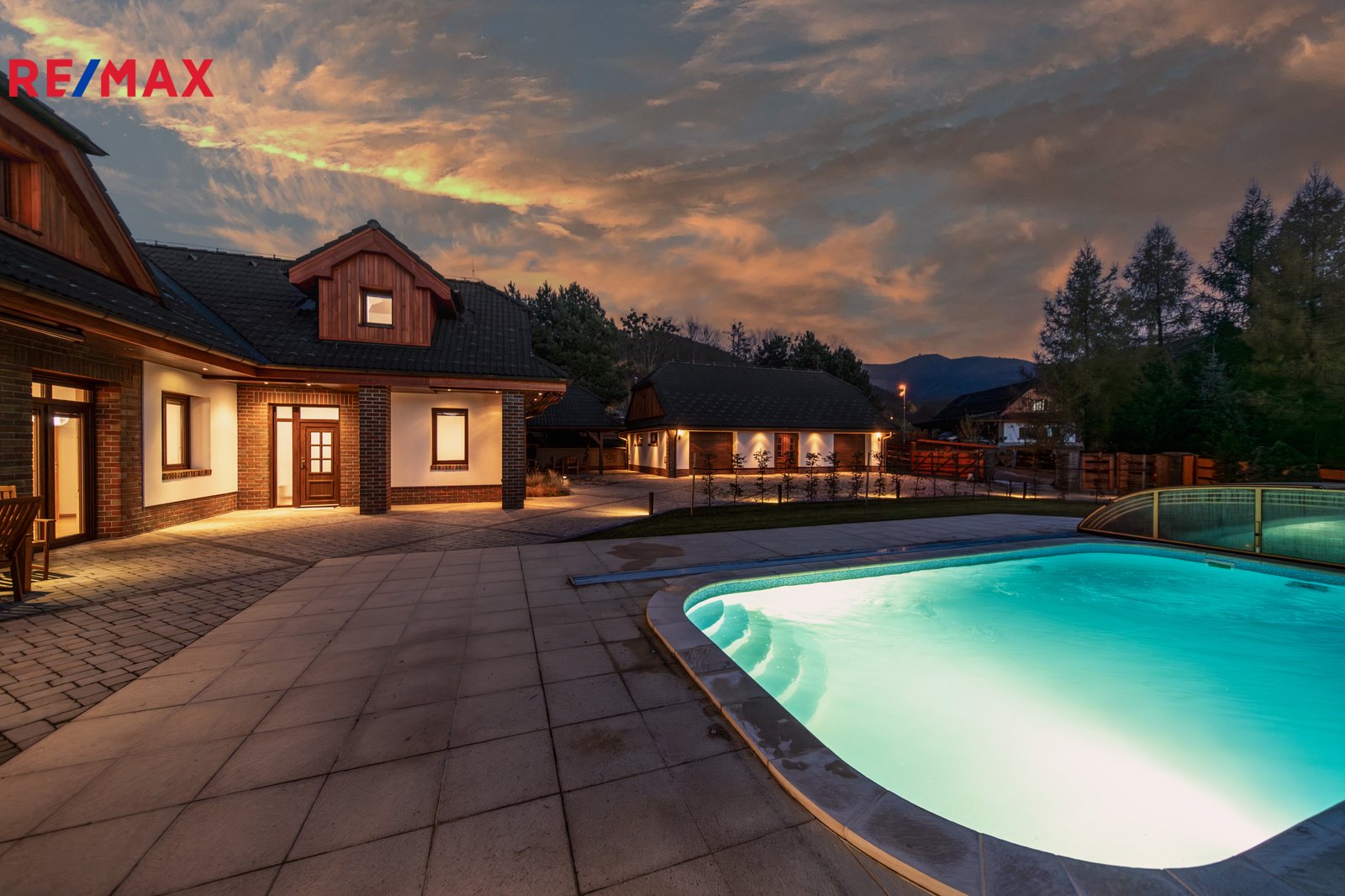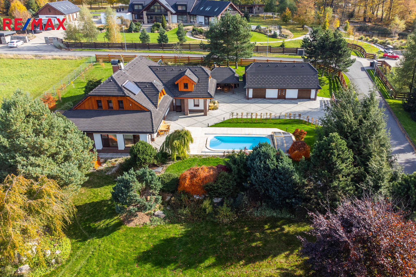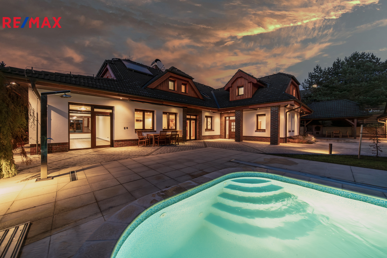 Rozsáhlé zpevněné plochy, terasa a připravený prostor pro bazén podtrhují charakter skutečného rodinného sídla. Pozemek poskytuje soukromí, otevřené výhledy do okolní krajiny a přímý kontakt s přírodou.