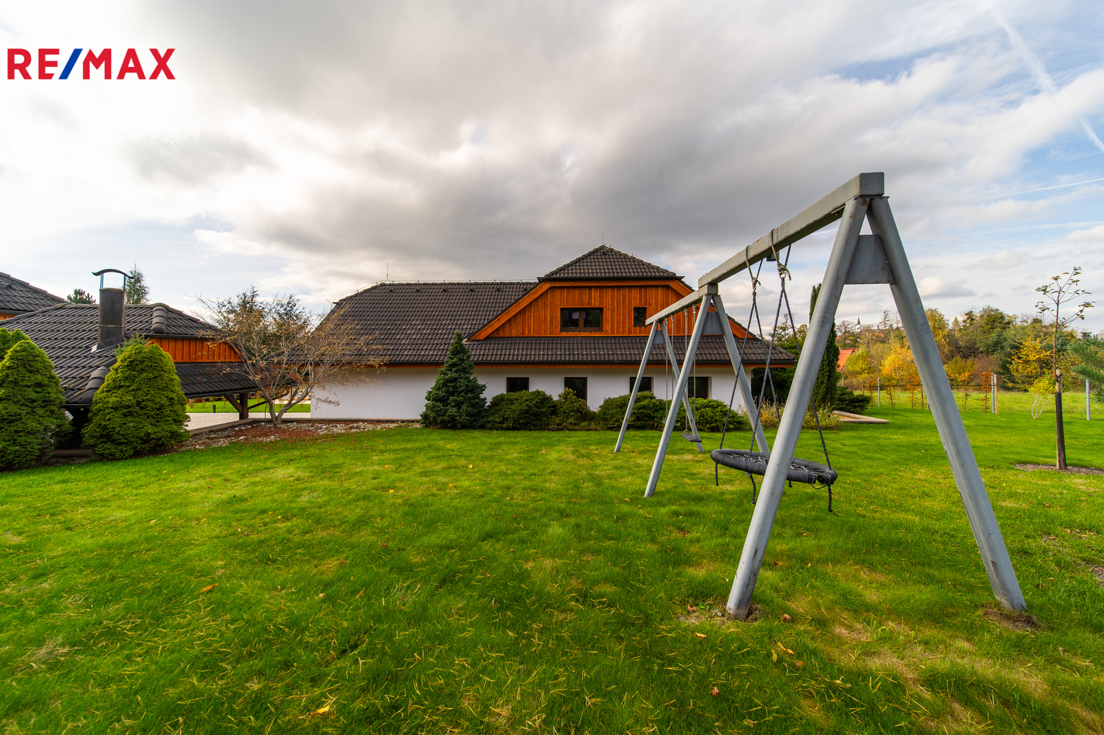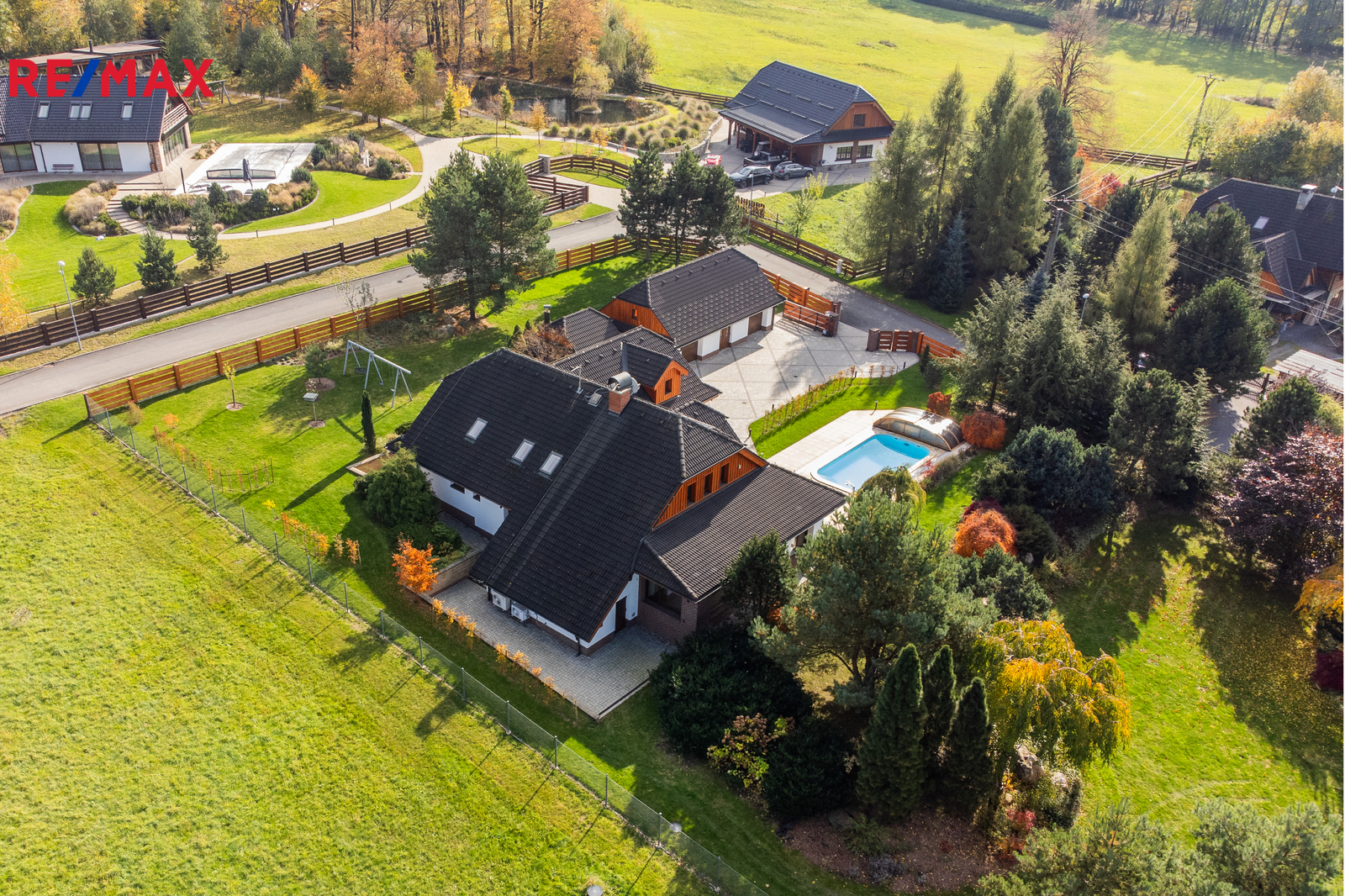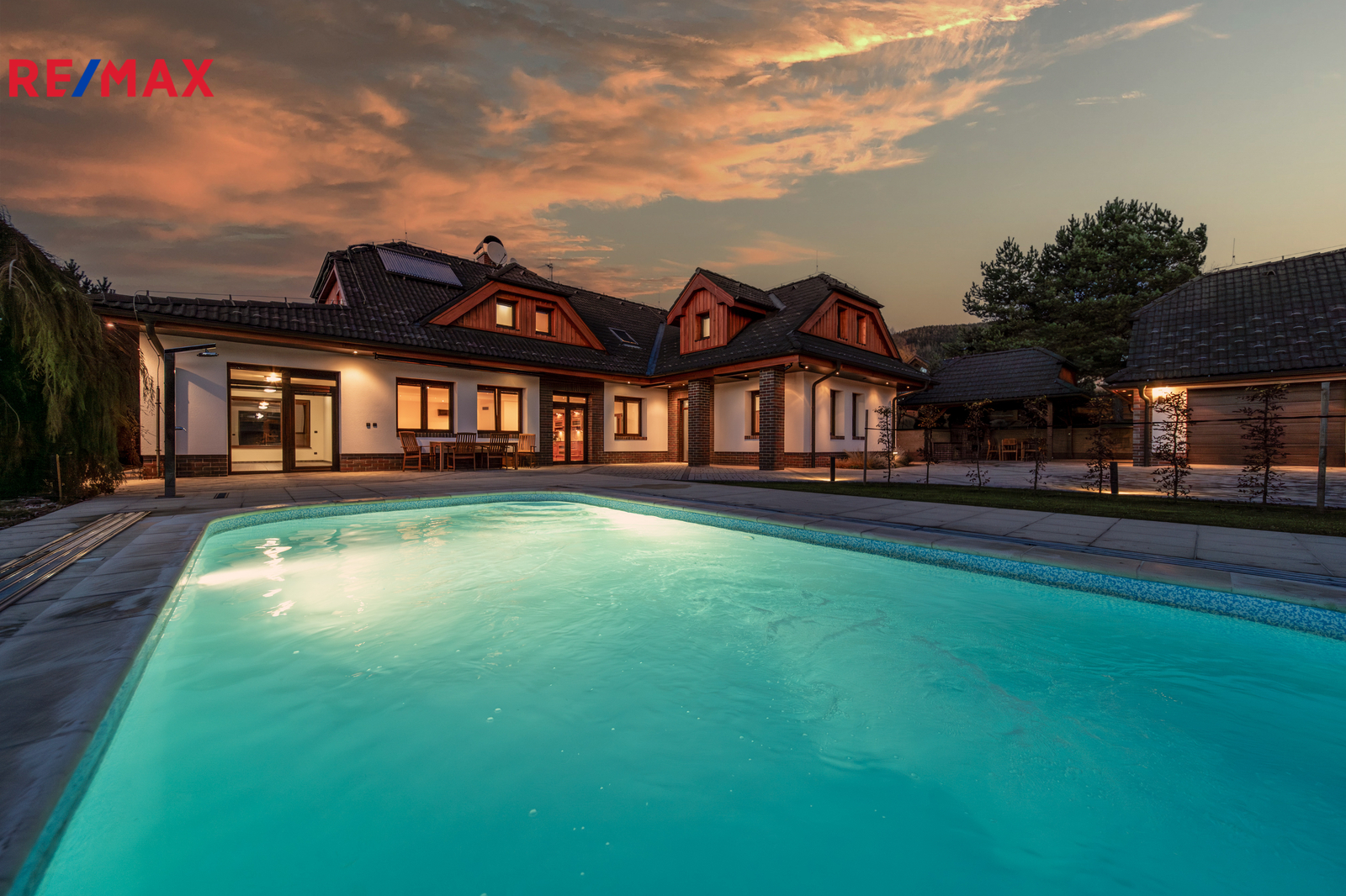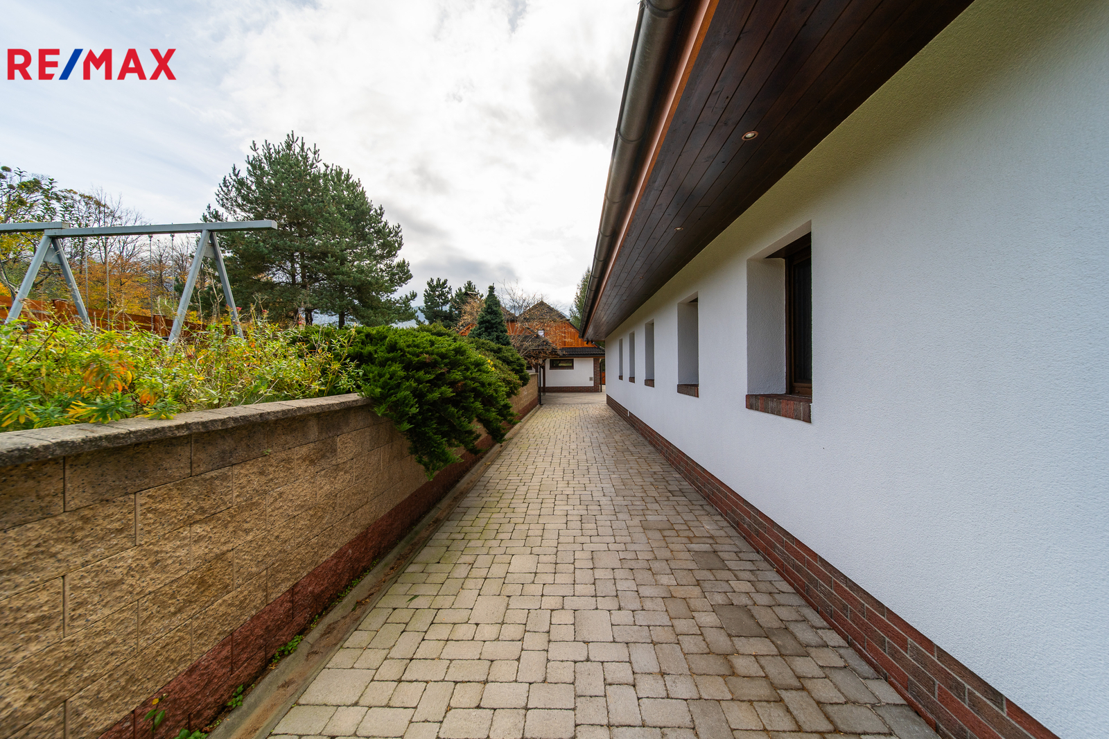 Rozsáhlé zpevněné plochy, terasa a připravený prostor pro bazén podtrhují charakter skutečného rodinného sídla. Pozemek poskytuje soukromí, otevřené výhledy do okolní krajiny a přímý kontakt s přírodou.