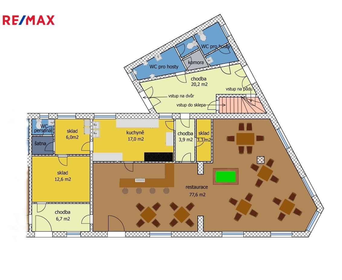 Objekt je sice primárně zařízen jako restaurace, ale jeho potenciál je mnohem širší. Prostor se dá skvěle využít také jako showroom, prodejna, ateliér nebo reprezentativní sídlo firmy. Pokud máte zajímavý podnikatelský záměr, který nevyžaduje provoz gastronomie, prostor se vám dokáže flexibilně přizpůsobit.