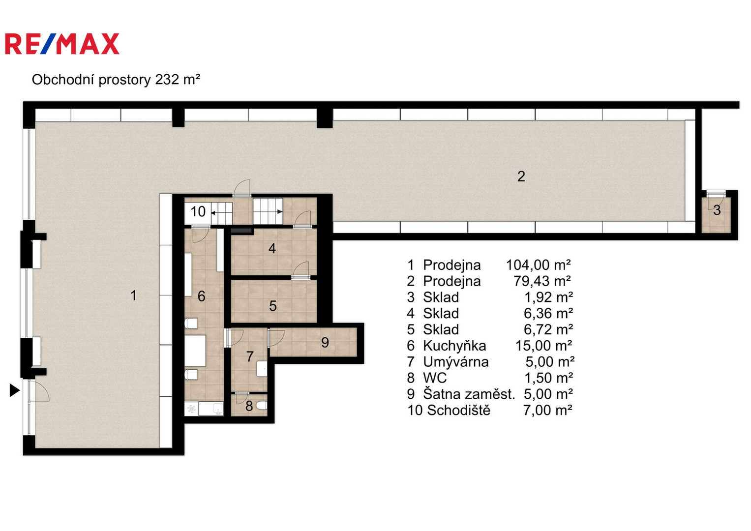 Dispoziční řešení zahrnuje hlavní obchodní část ve tvaru L o výměře 183,50 m², tři sklady o velikostech 6,36 m², 6,72 m², 1,92 m²a zázemí, které tvoří kuchyňka 15 m², umývárna 5 m², WC 1,5 m², šatna pro zaměstnance 5 m² a schodiště 7 m².