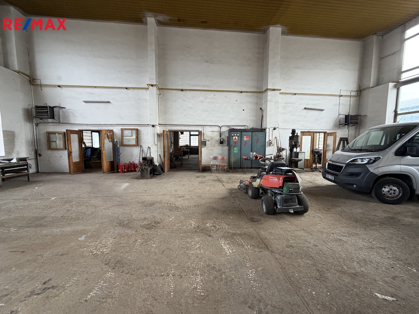 Jedna velká dílna, která příjezdová vrata z každé strany, vysoká přes 3 m a široká také tak. K tomu jsou tři další menší dílny (prostory).