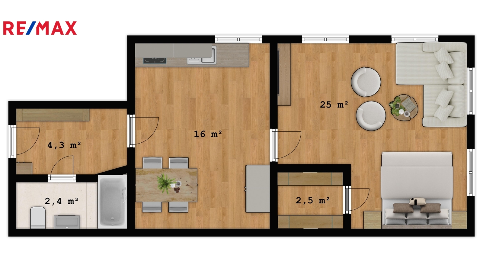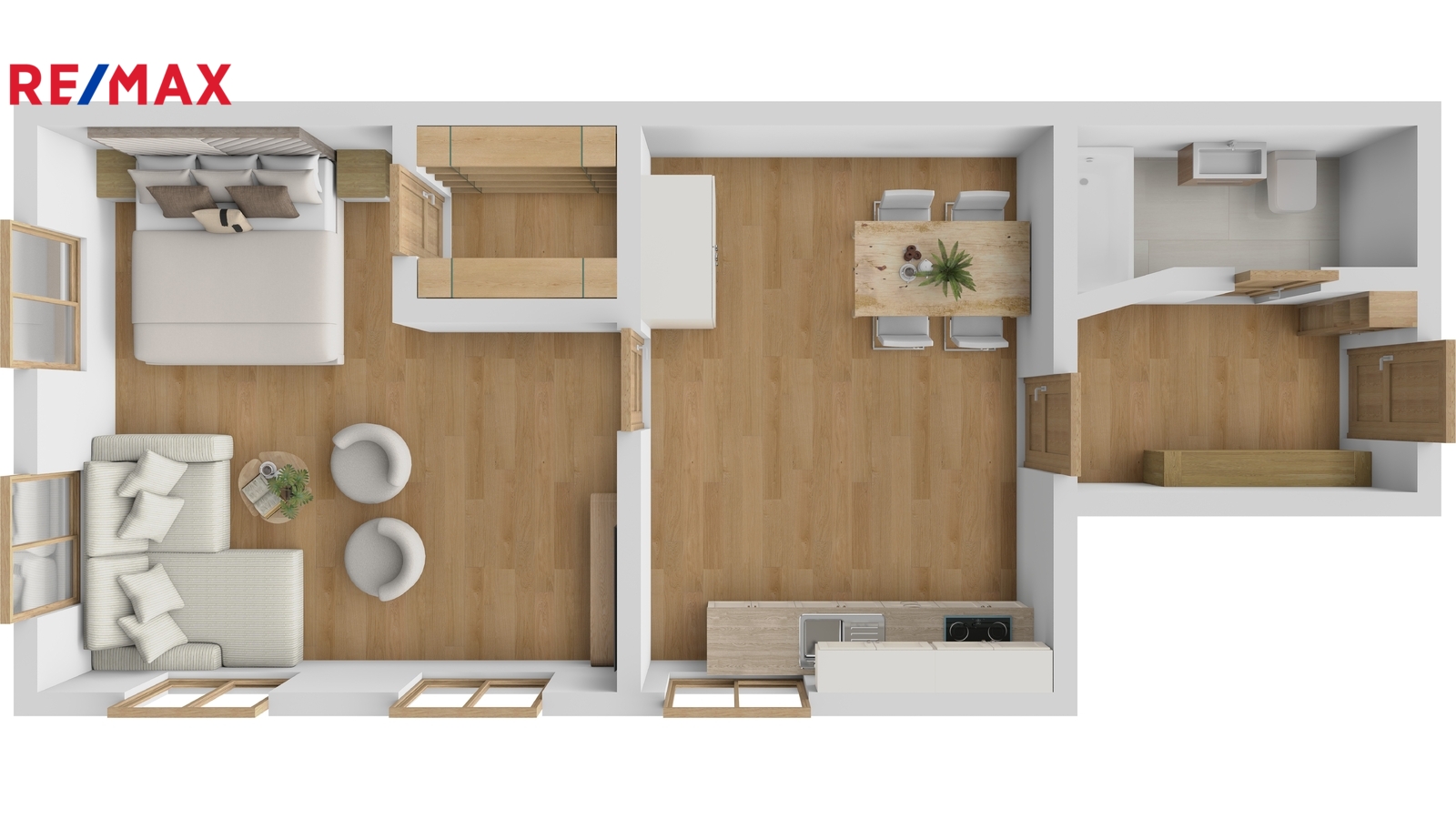 Okna jsou situována na dvě světové strany. Byt je rozložen na dva průchozí samostatné pokoje, koupelnu, předsíň a malou komoru s mnoha možnostmi využití v druhém pokoji.