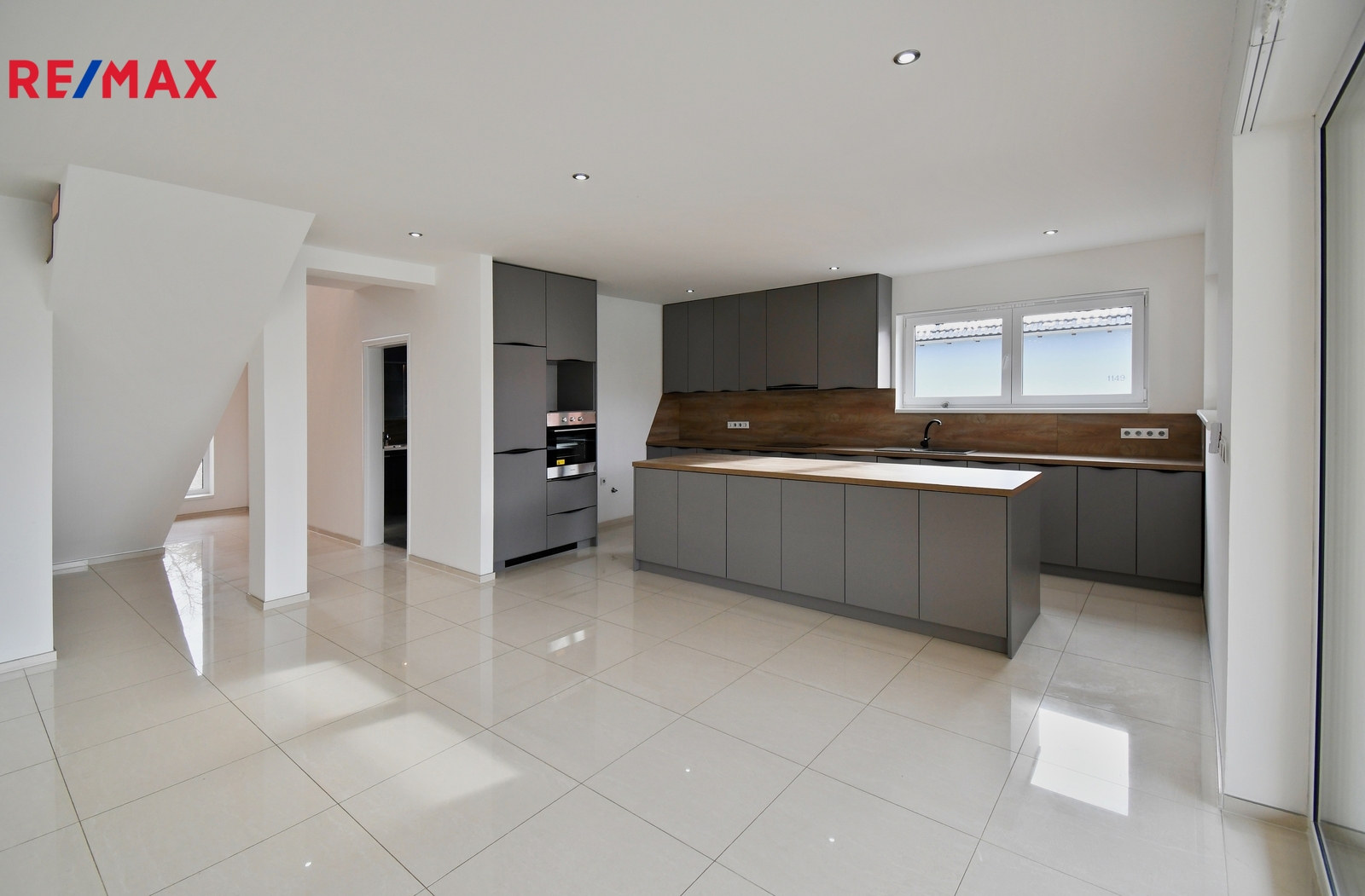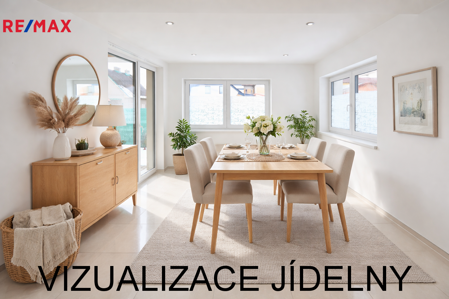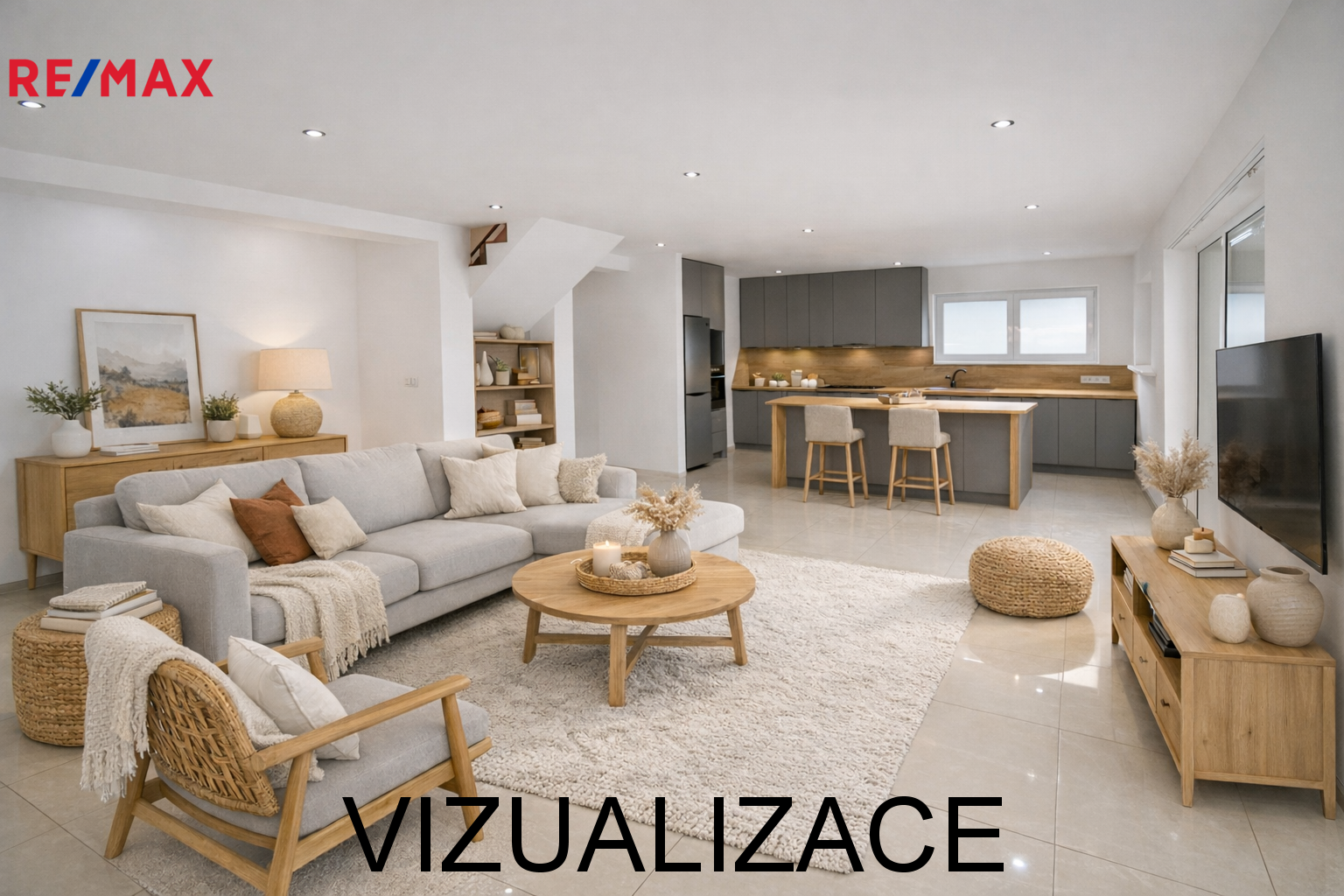 Přízemí je řešeno jako otevřený společenský prostor s přímým vstupem na terasu a zahradu. Dominantou je prostorná obytná část s obývacím pokojem propojeným s kuchyní, kde najdete zcela novou kuchyňskou linku s moderním ostrůvkem. Kuchyň je vybavena vestavnými spotřebiči – lednicí s mrazákem, myčkou, sklokeramickou troubou – a nabízí dostatek pracovní i úložné plochy. Na kuchyň plynule navazuje světlý prostor zimní zahrady / jídelny, který je díky oknům z více stran ideální jako jídelní kout, relaxační zóna nebo klidné místo na práci.