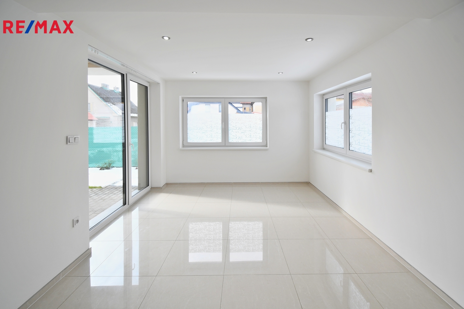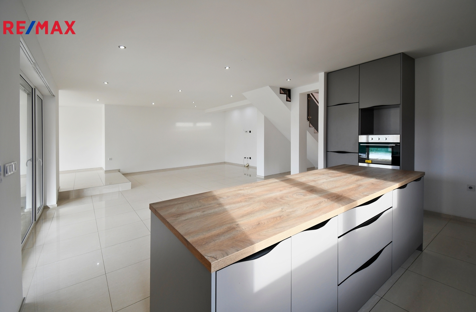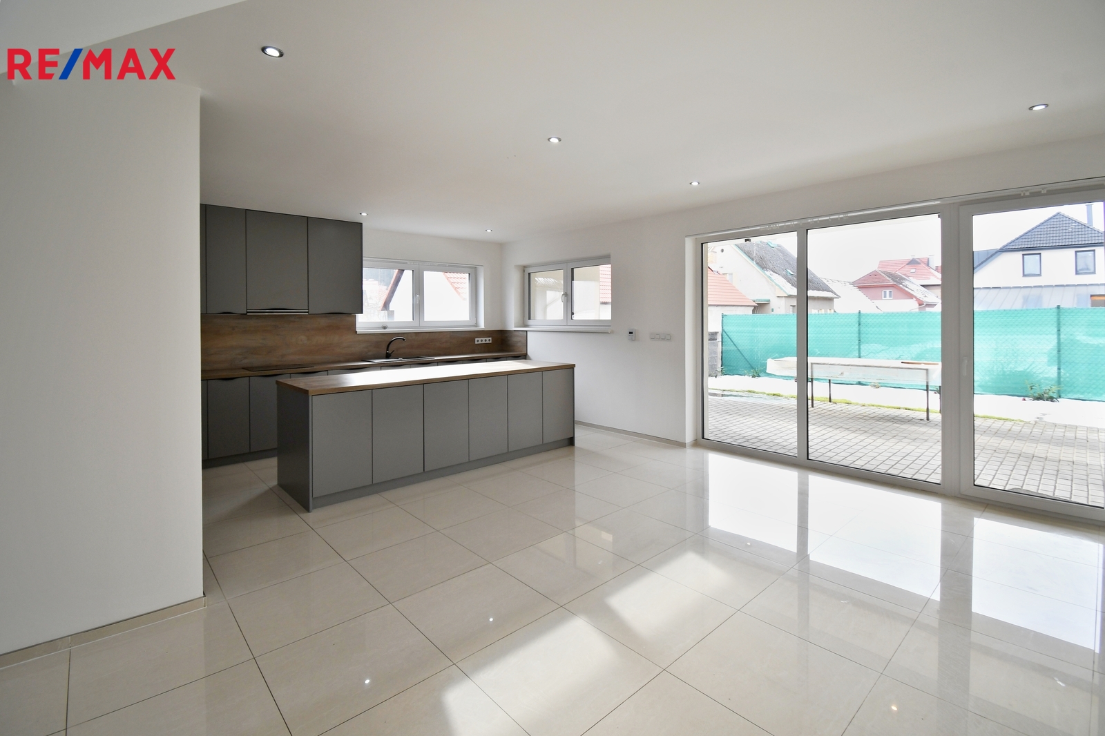 Přízemí je řešeno jako otevřený společenský prostor s přímým vstupem na terasu a zahradu. Dominantou je prostorná obytná část s obývacím pokojem propojeným s kuchyní, kde najdete zcela novou kuchyňskou linku s moderním ostrůvkem. Kuchyň je vybavena vestavnými spotřebiči – lednicí s mrazákem, myčkou, sklokeramickou troubou – a nabízí dostatek pracovní i úložné plochy. Na kuchyň plynule navazuje světlý prostor zimní zahrady / jídelny, který je díky oknům z více stran ideální jako jídelní kout, relaxační zóna nebo klidné místo na práci.