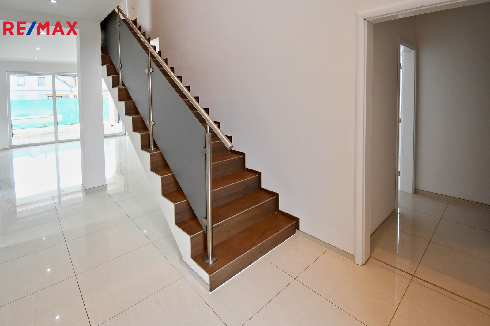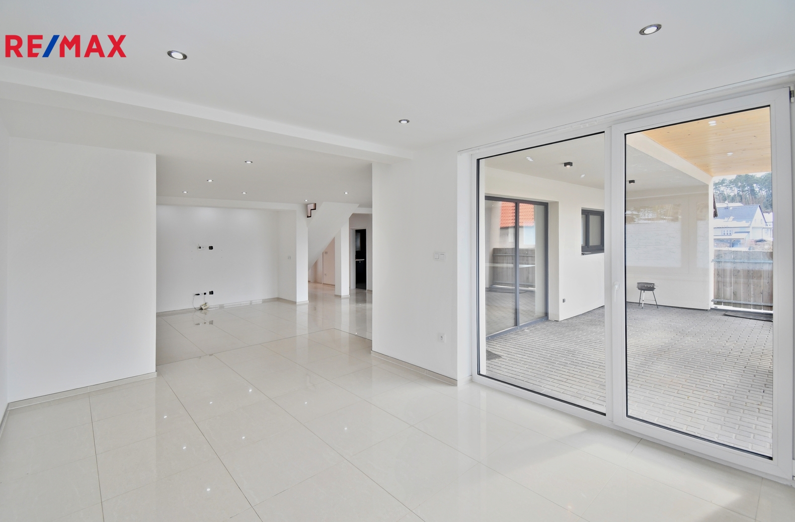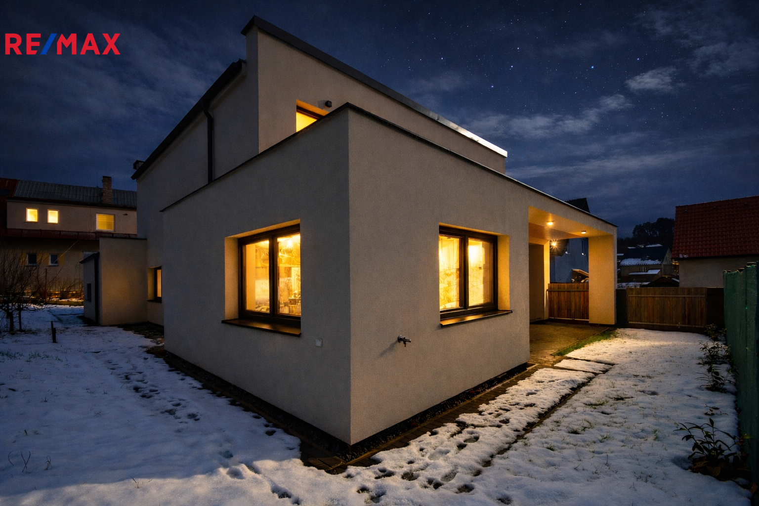 Dům disponuje podlahovou plochou 200 m², nabízí krytou terasu a zahradu o velikosti cca 200 m², ideální pro relax, dětské hry nebo letní grilování. Celkově působí velmi vzdušně díky velkým proskleným plochám, které zároveň přivádějí do interiéru dostatek denního světla.