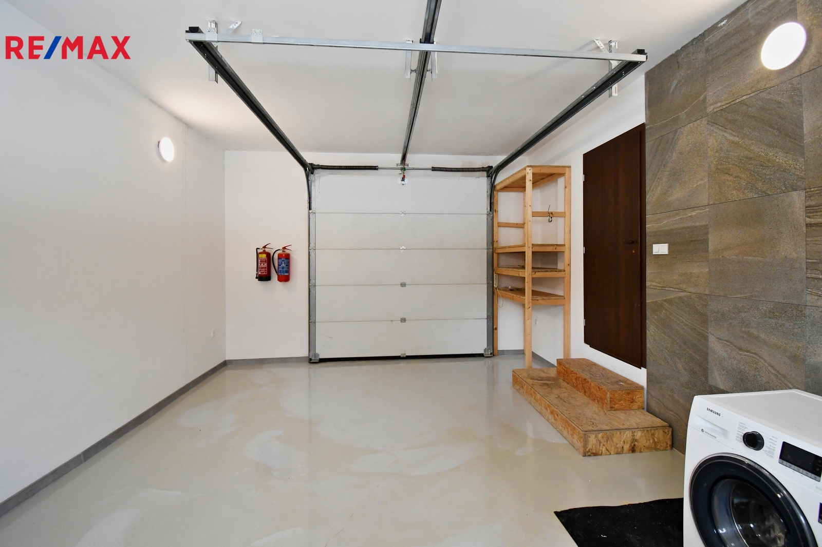 Dále se v přízemí nachází samostatný pokoj (skvěle využitelný jako pracovna, pokoj pro hosty nebo pokoj pro člena rodiny, který preferuje bydlení bez schodů), koupelna se sprchovým koutem, a velkou praktickou výhodou je i garáž se vstupem přímo do obytné části – komfortní řešení zejména v zimních měsících či při každodenním fungování rodiny.