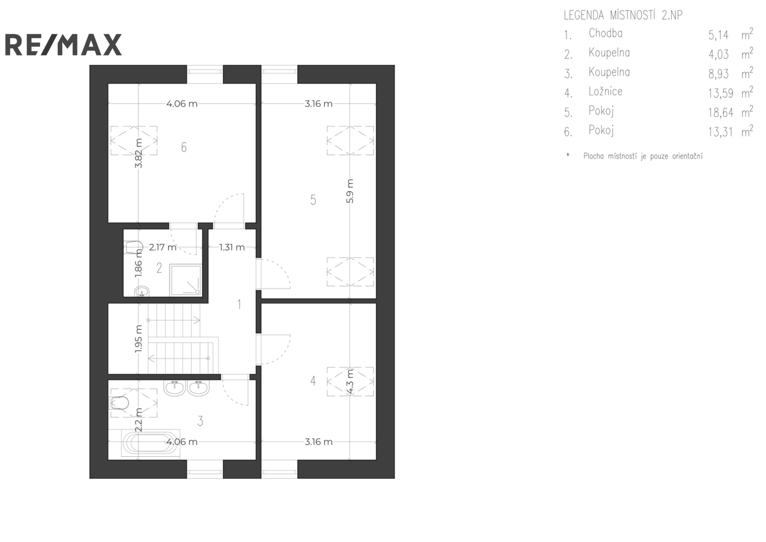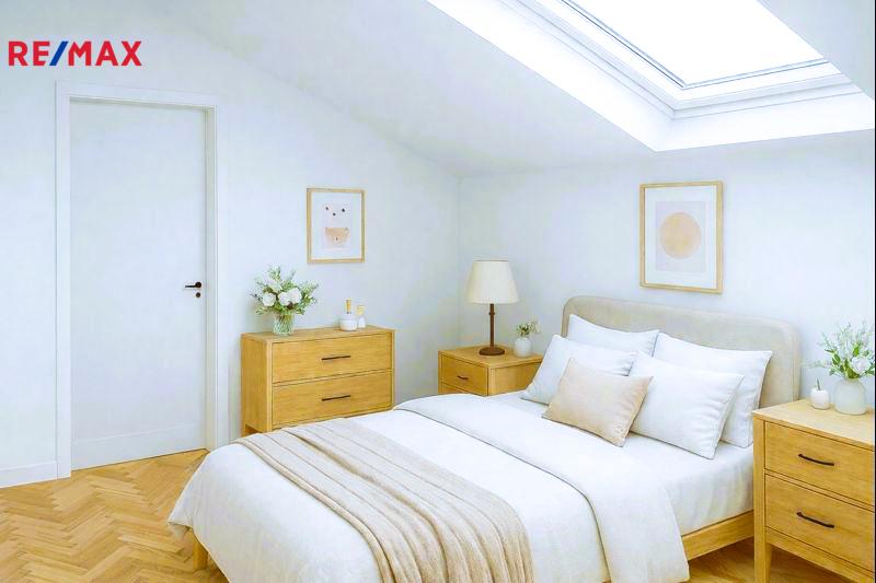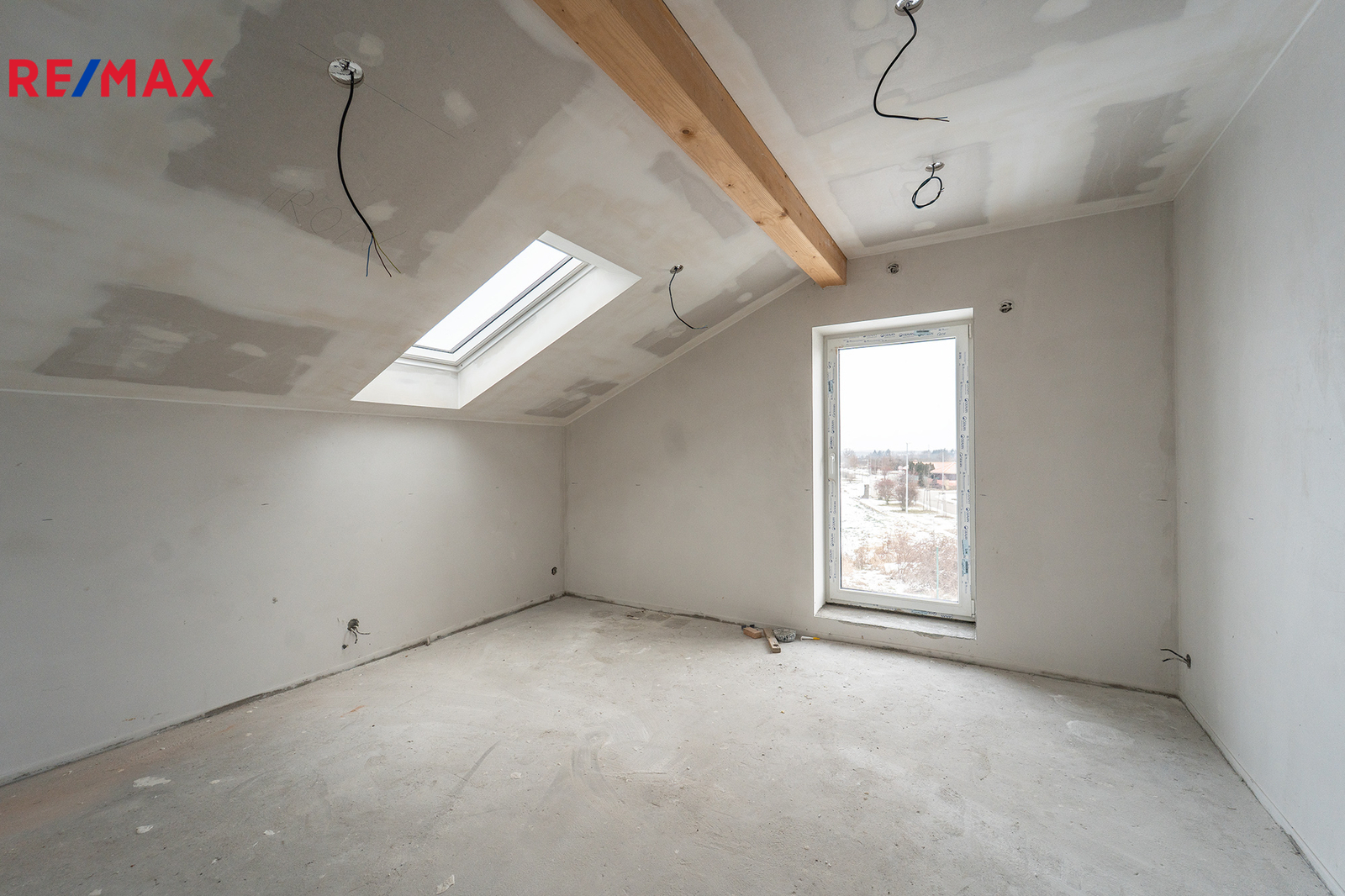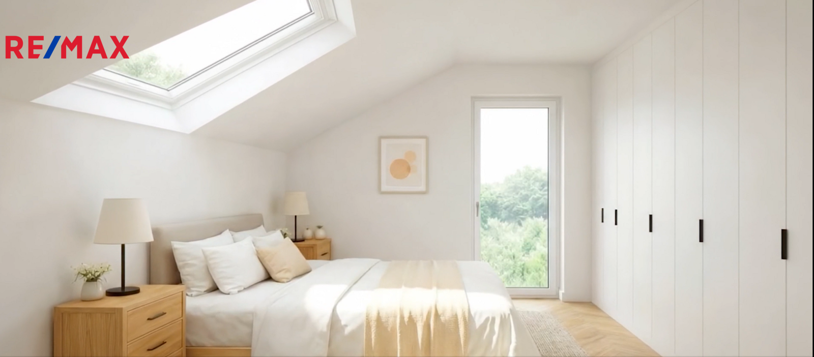 V patře se třemi pokoji se nachází klidová zóna, navržená s důrazem na soukromí a pohodlí každého člena rodiny. Hlavní ložnice disponuje vlastní koupelnou se sprchovým koutem, zatímco druhá, centrální koupelna je vybavena vanou, dvojumyvadlem s designovým osvětlením a elegantní sanitou.