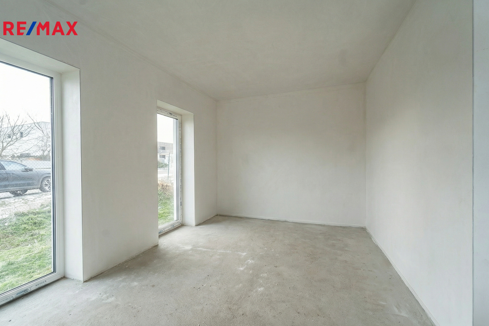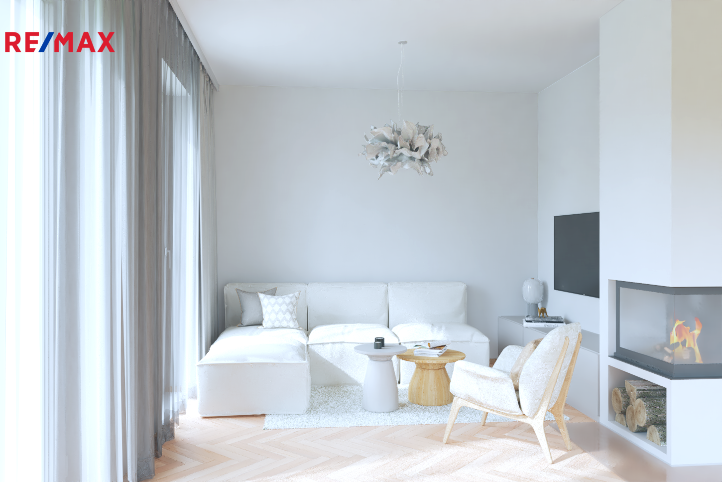 Přízemí poskytuje velkorysý a promyšleně řešený obytný prostor, který přirozeně propojuje interiér se zahradou. Dominantou je světlý obývací pokoj s přípravou na krb, jenž spolu s kuchyní a jídelnou tvoří ideální místo pro rodinný život i společenská setkání. Velkoformátová francouzská okna zajišťují dostatek denního světla a plynulý přechod na terasu. V přízemí je také další pokoj, který lze využít jako pracovnu, další ložnici, či pokoj pro hosty.