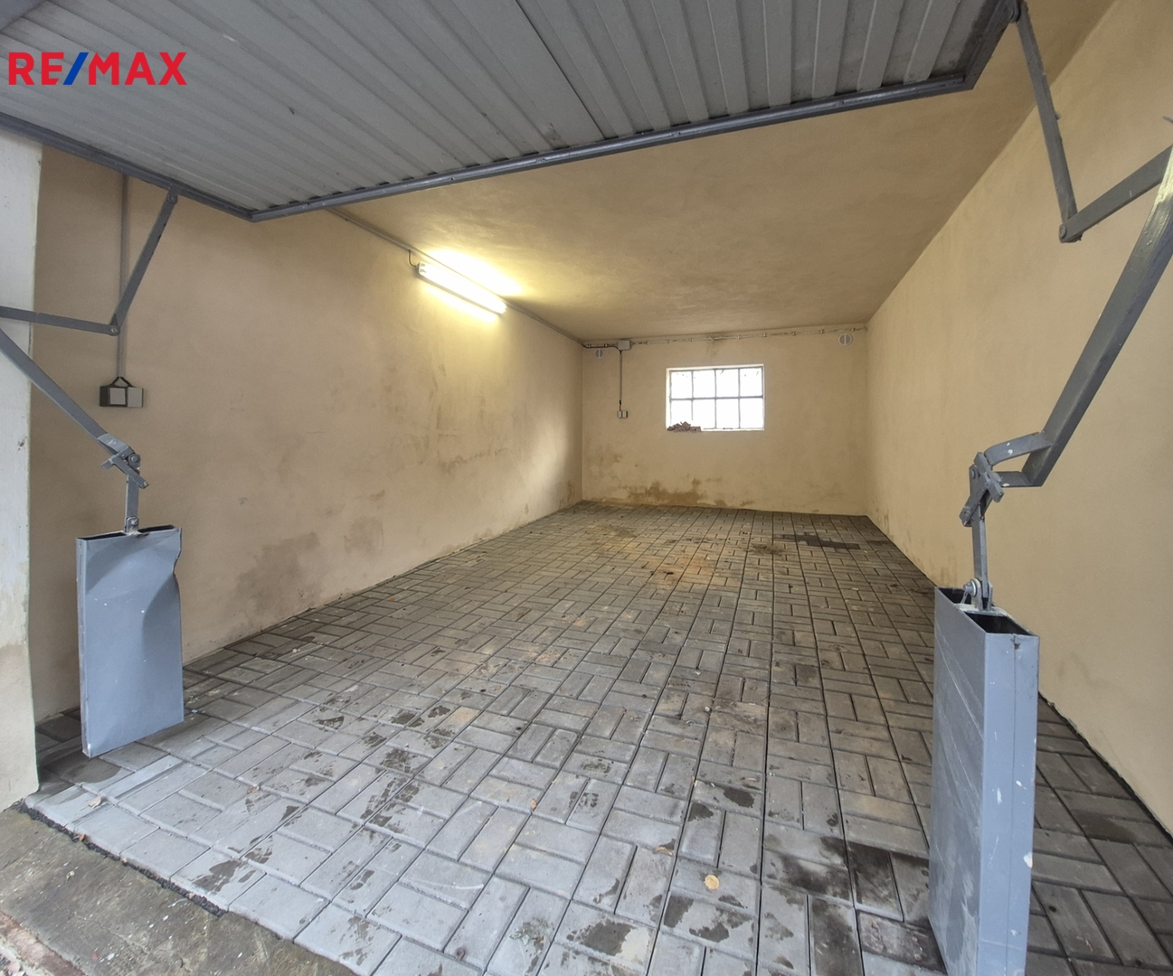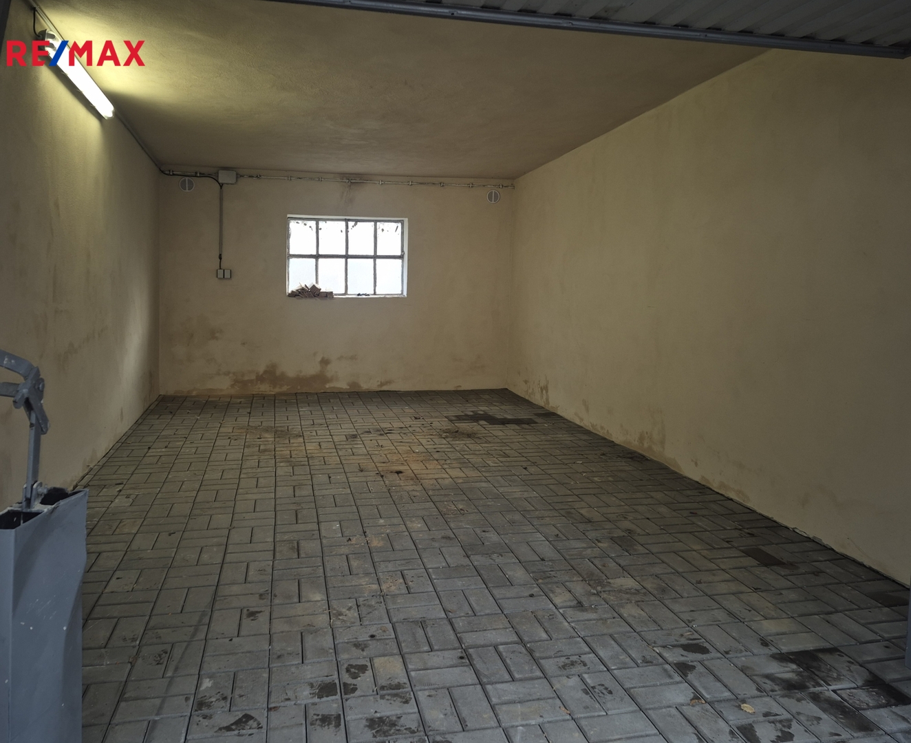 Garáž je v dobrém technickém stavu, má plechová výklopná vrata. V garáži je nová elektřina a podlaha s betonové dlažby. Celková plocha stavební parcely (pozemku) je 36 m2.