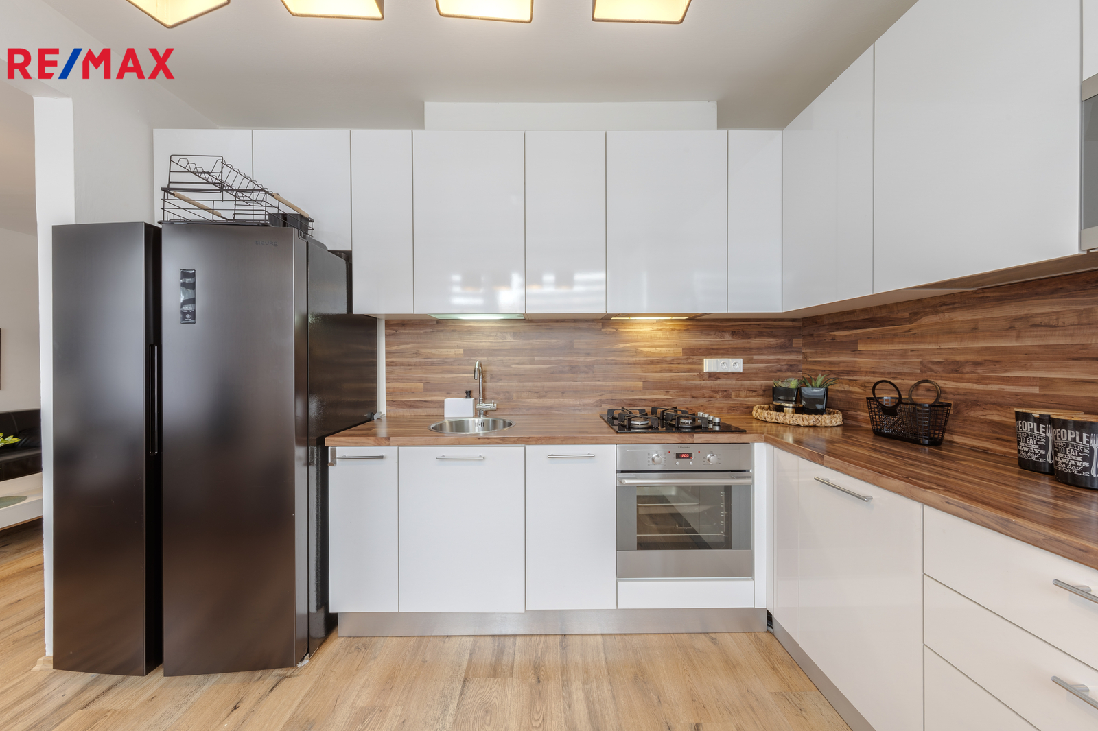 Součástí kuchyňské linky je nová prostorná lednice, digestoř, plynový sporák, elektrická trouba, mikrovlnná trouba a nádobí.