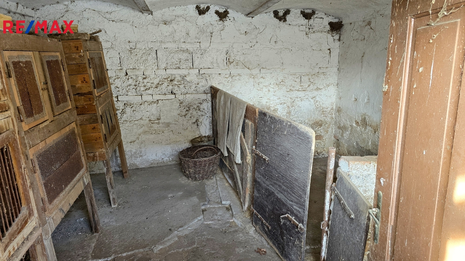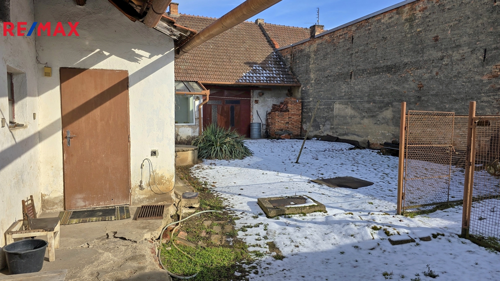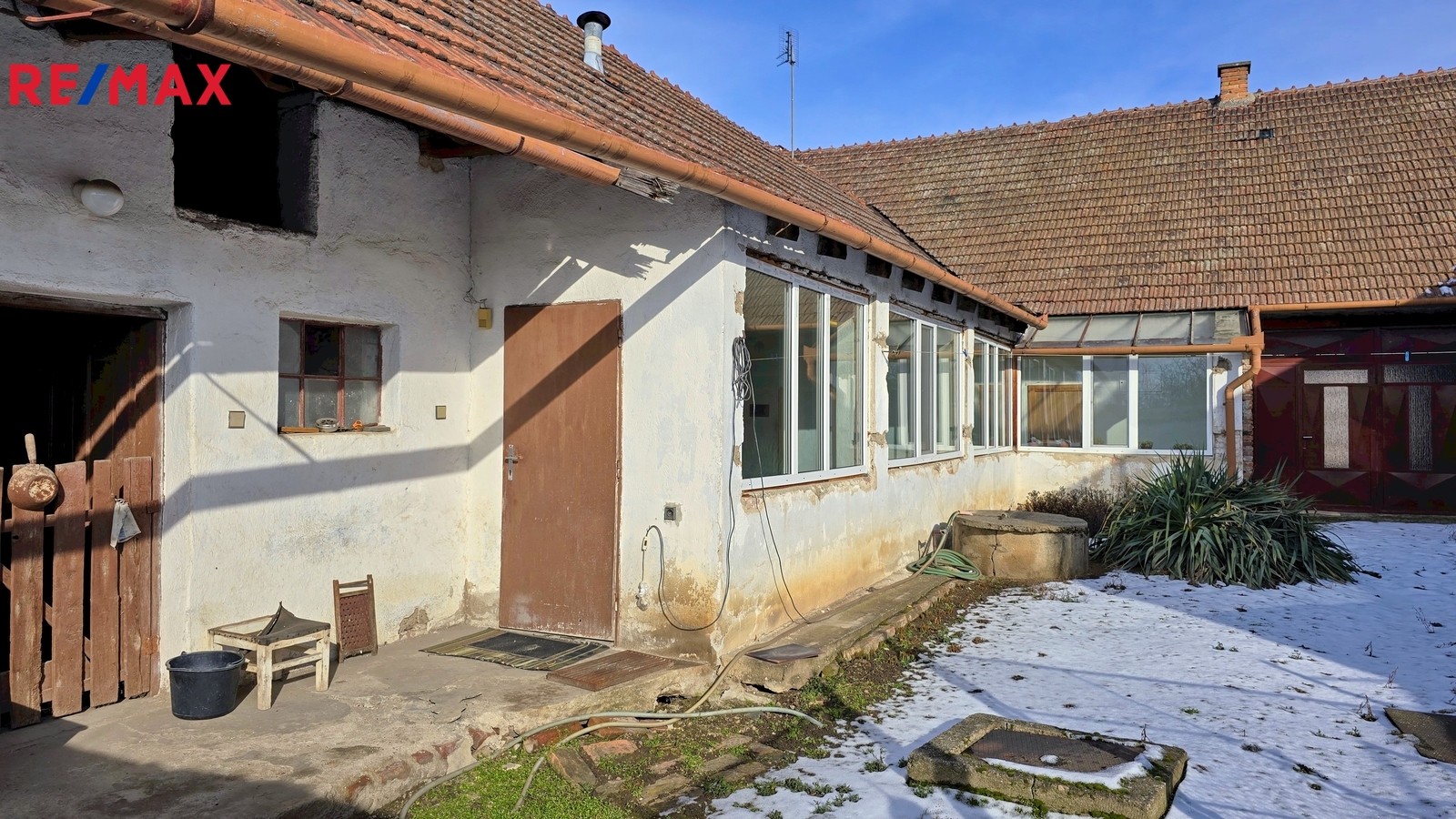 Na dvoře se nachází původní chlév a sklad, za nimiž se rozprostírá velká zahrada – ideální pro odpočinek, pěstování nebo rodinné zázemí.