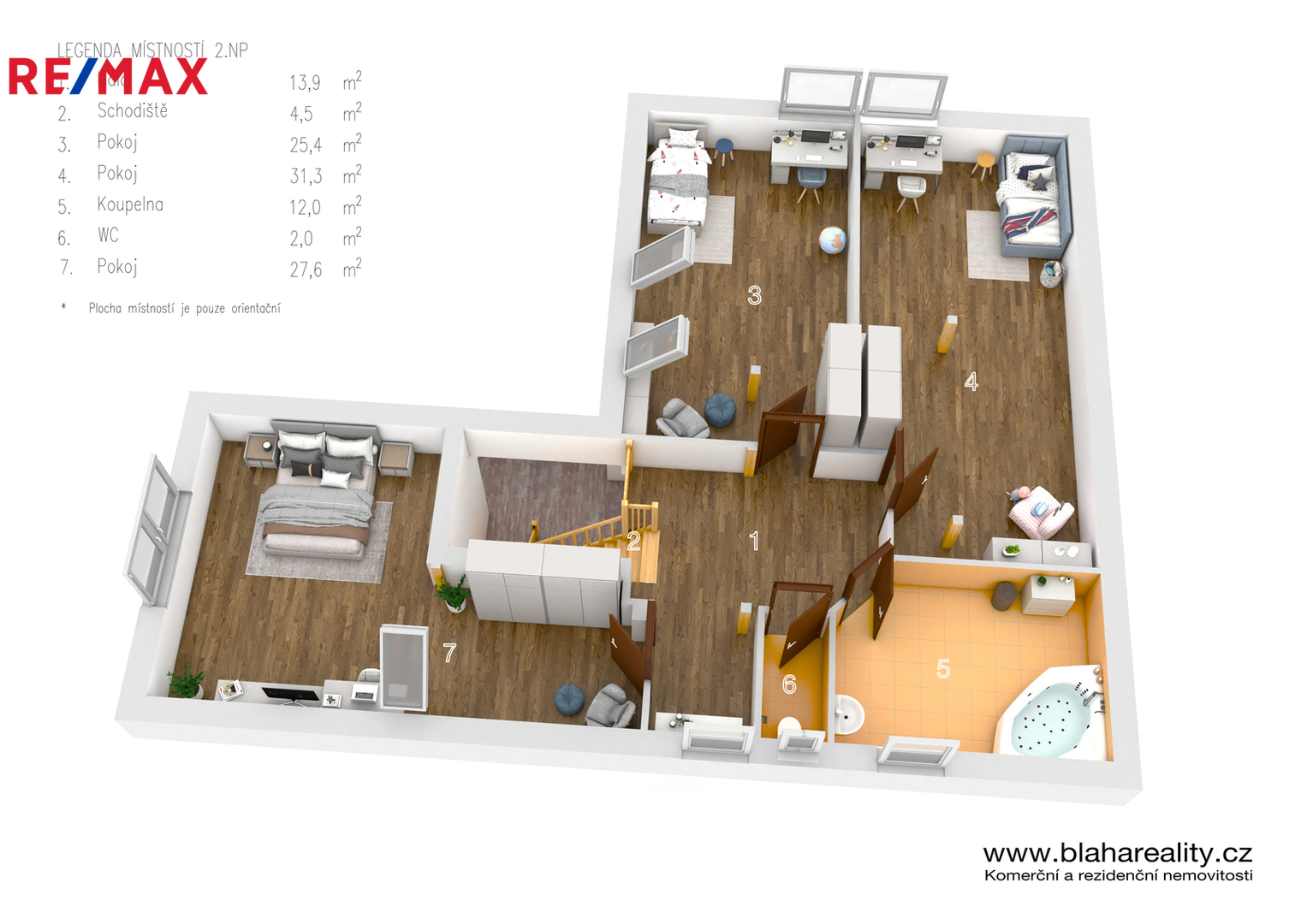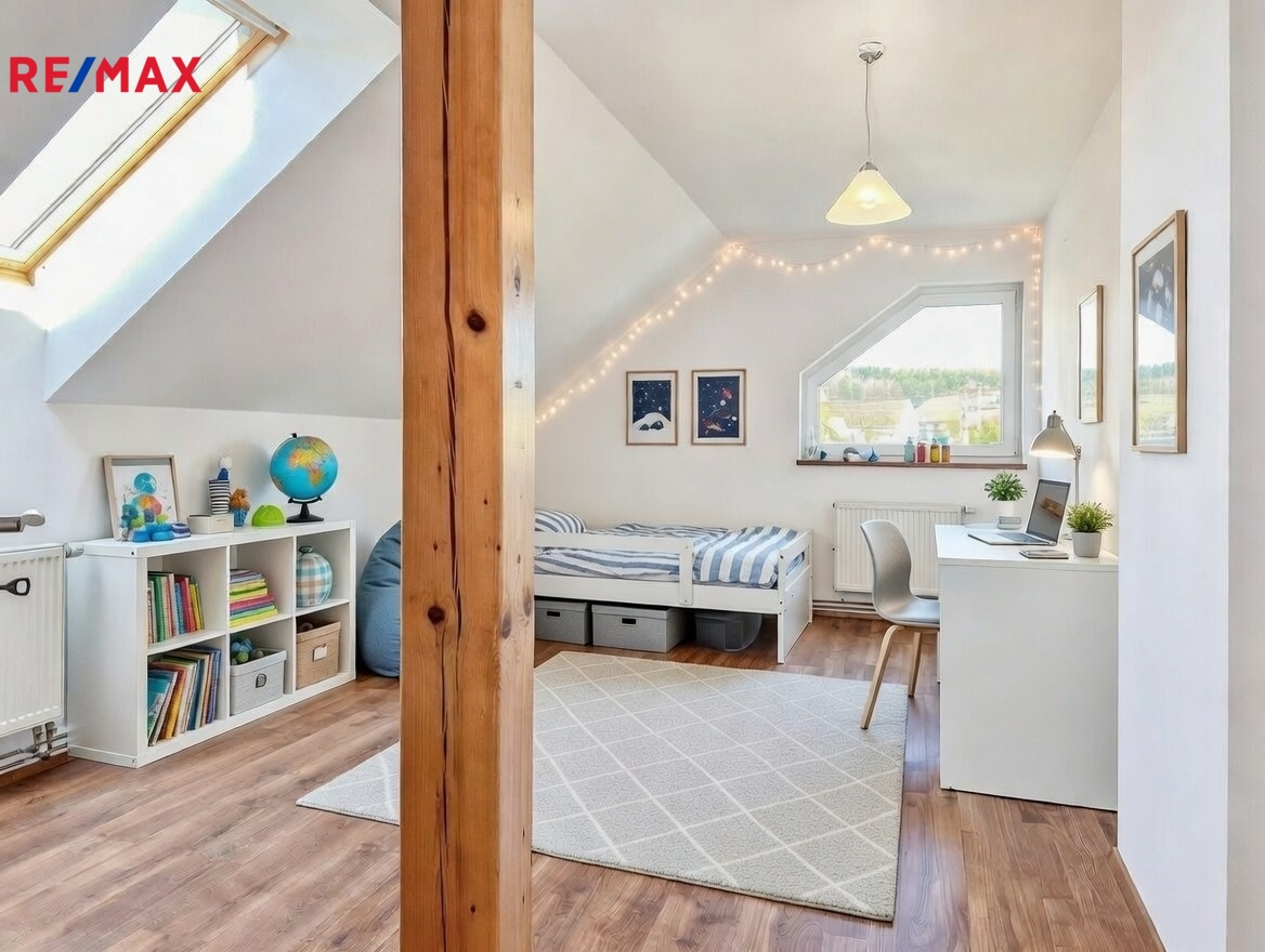 Podkroví o orientační výměře 116 m² tvoří plnohodnotnou obytnou část domu. Nacházejí se zde tři prostorné pokoje vhodné jako ložnice, dětské pokoje či pracovna, dále koupelna, samostatné WC a chodba. Podkroví bylo dokončeno v roce 2015 a je kvalitně izolováno, což zajišťuje komfortní bydlení i během letních měsíců.