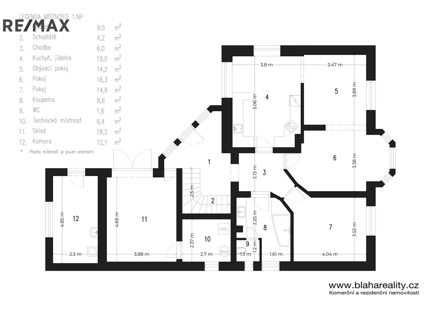 Přízemí o orientační výměře 122 m² nabízí kuchyni s jídelnou, obývací pokoj a dva další pokoje. Dále je zde koupelna s podlahovým vytápěním, samostatné WC, sklad, chodba, kotelna a prádelna. Silné obvodové zdi o šířce 40 až 50 cm přispívají k výborné tepelné stabilitě, v zimě drží teplo a v létě pomáhají udržovat příjemné klima.