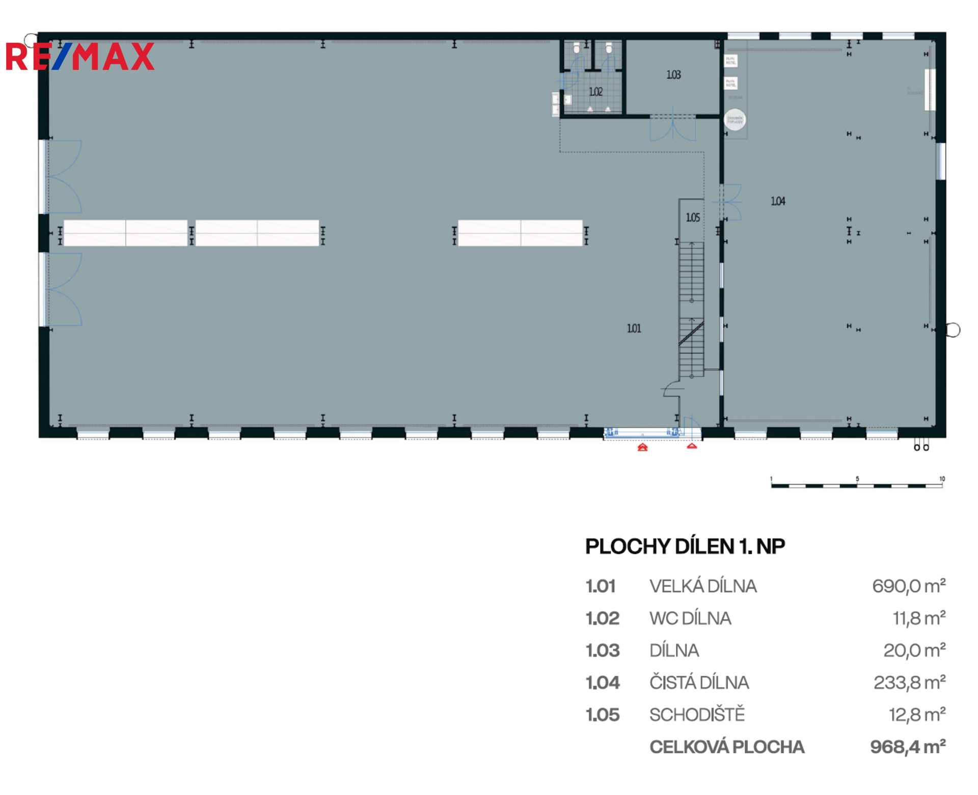 * Podlaha: těžká železobetonová průmyslová podlaha s izolací proti vodě, nosnost 5 t/m².