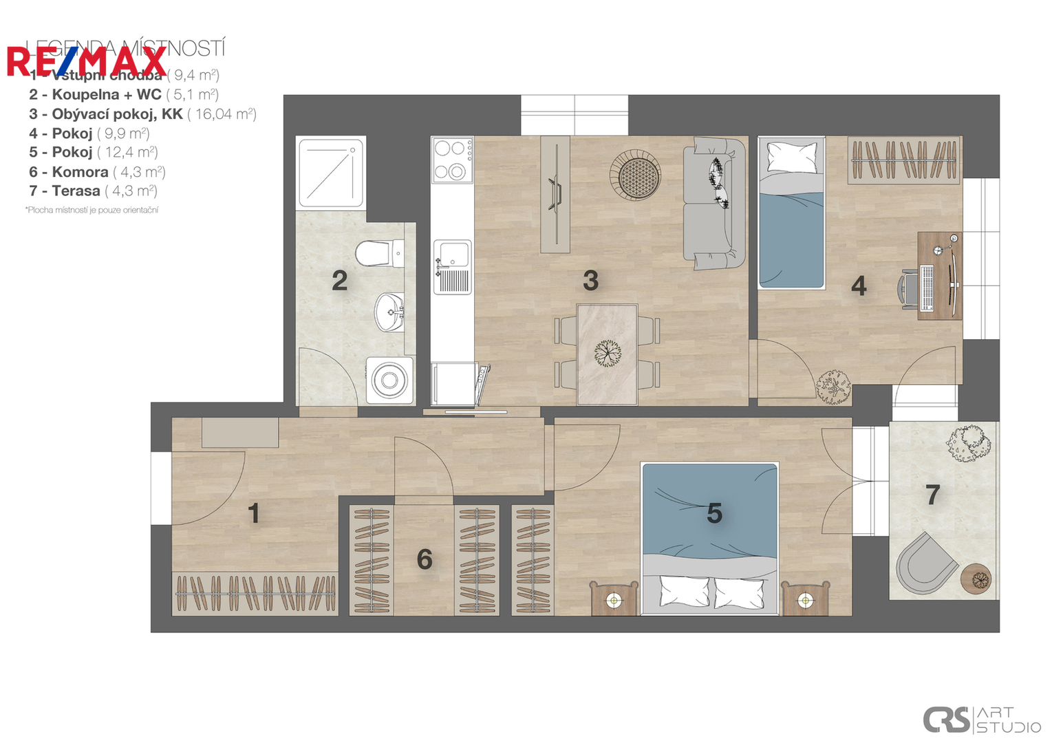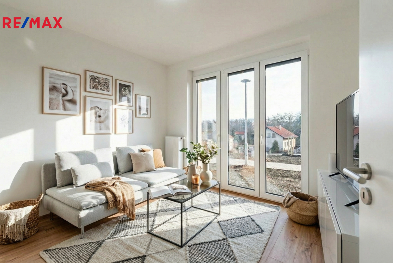 Vybavení bytu zahrnuje novou moderní kuchyňskou linku s vestavěnými spotřebiči (lednice, mrazák, indukční deska, trouba, myčka). V koupelně je prostorný sprchový kout, toaleta, umyvadlo, otopný žebřík a přípojka na pračku. Byt je prostorný a světlý díky velkým oknům. V předsíni najdete místo pro šatní skříň a komora přímo v bytu poskytne dostatek úložného prostoru.