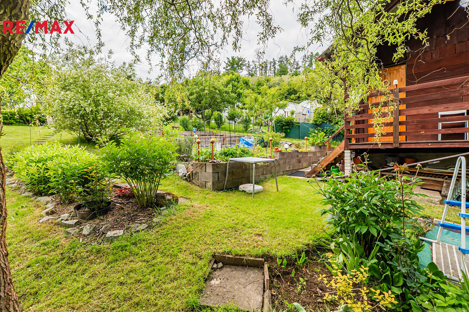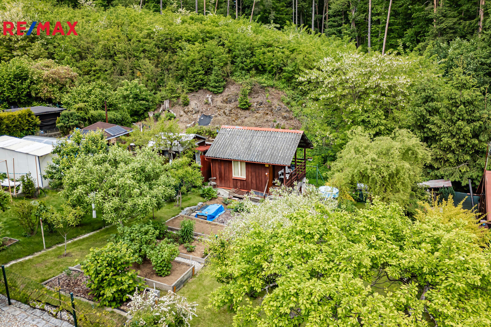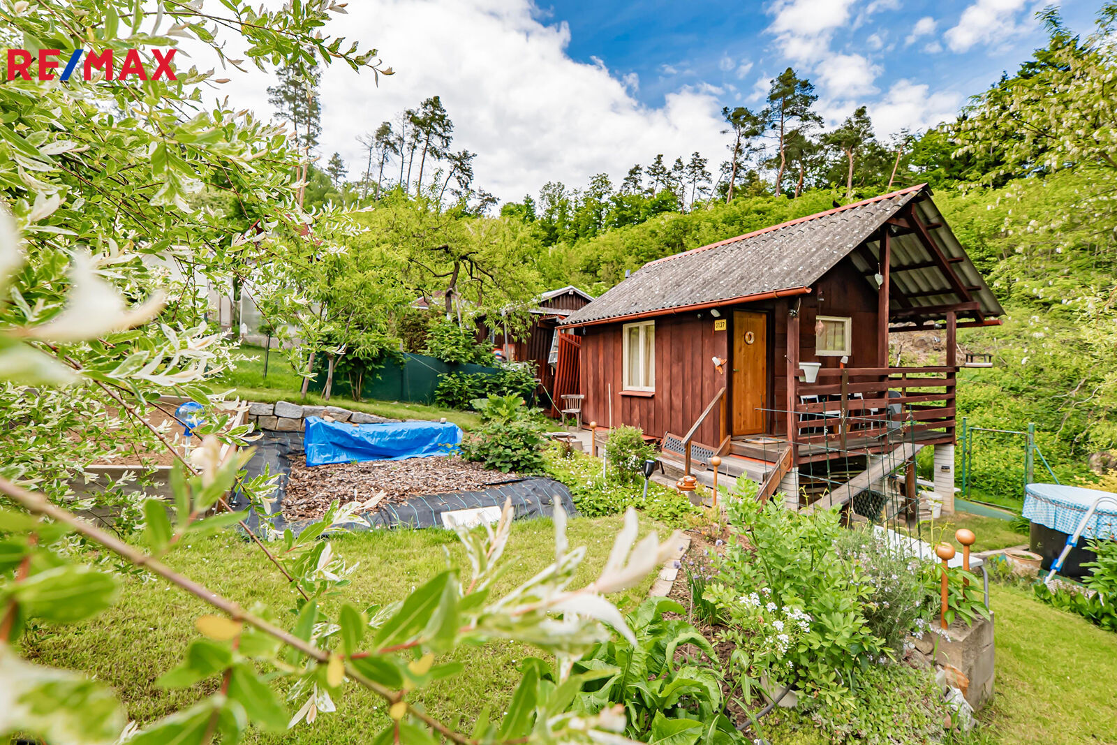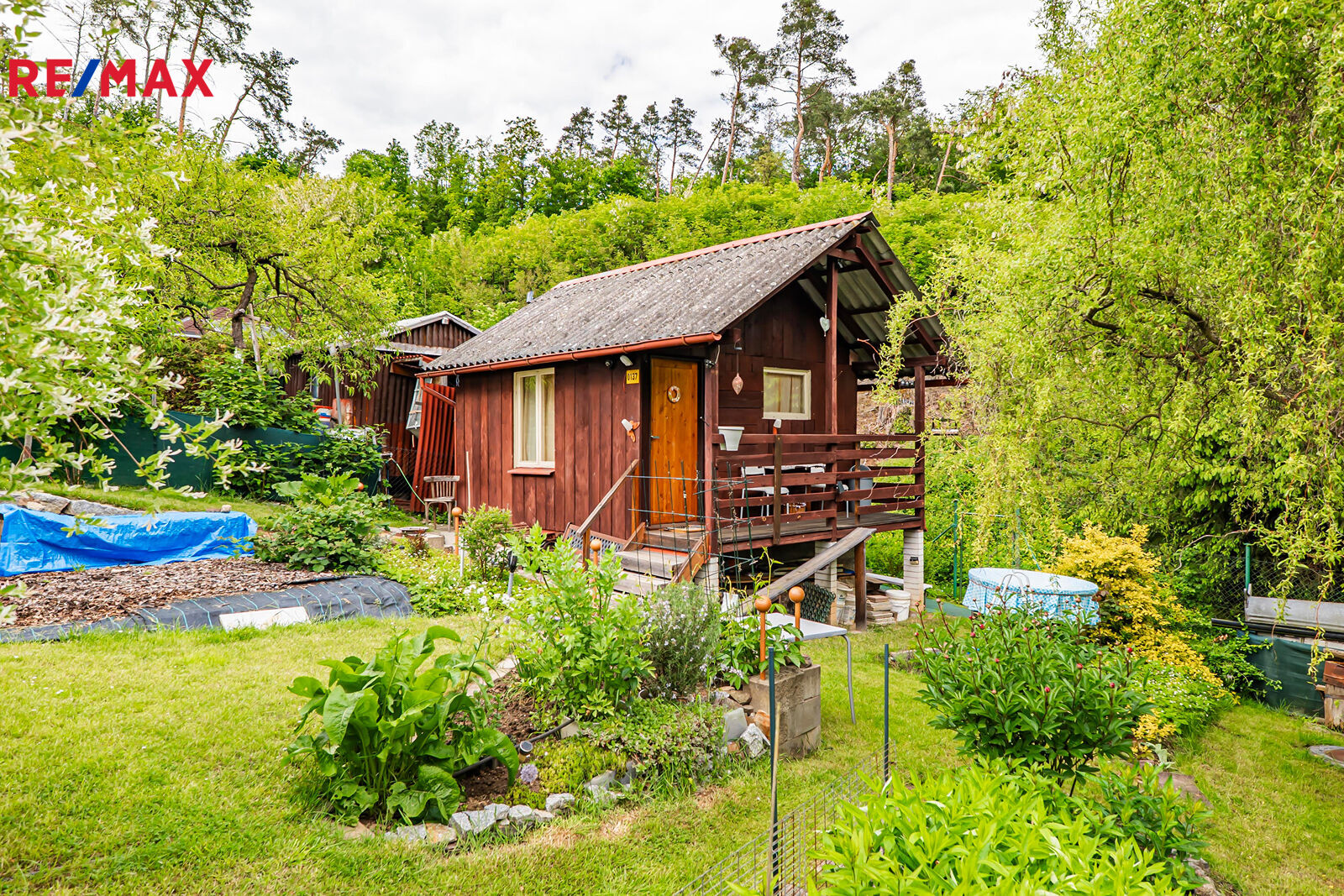 Na pozemku se nachází samostatná dřevěná kůlna se suchým záchodem a úložným prostorem, vyvýšené záhony pro pěstování zeleniny a ovocné stromy a keře (např. jabloně, rybíz, maliny).