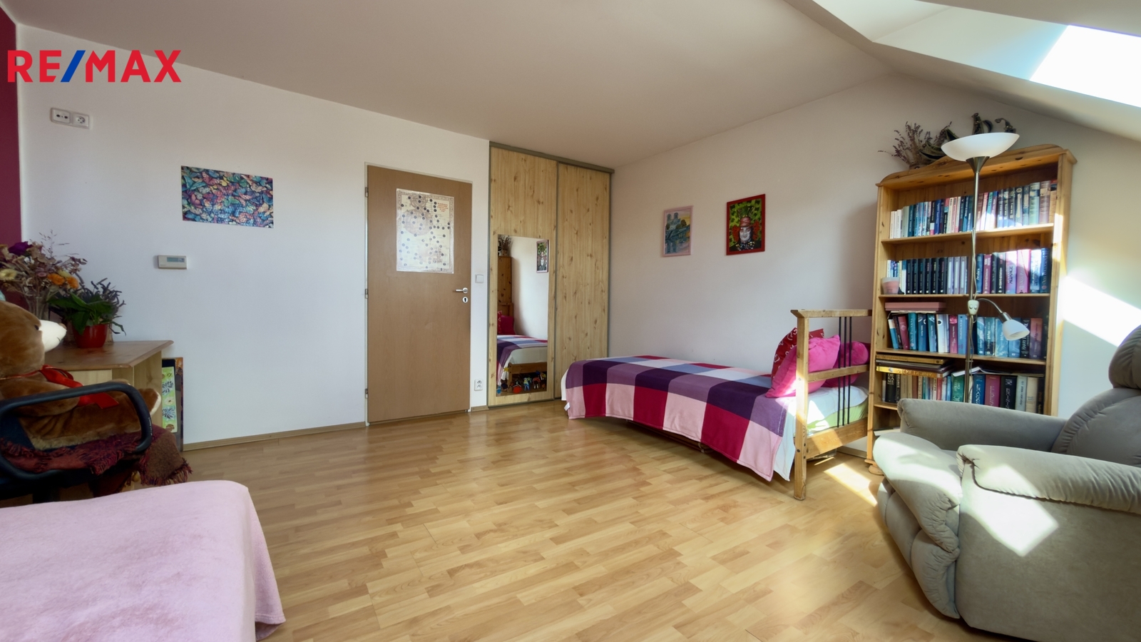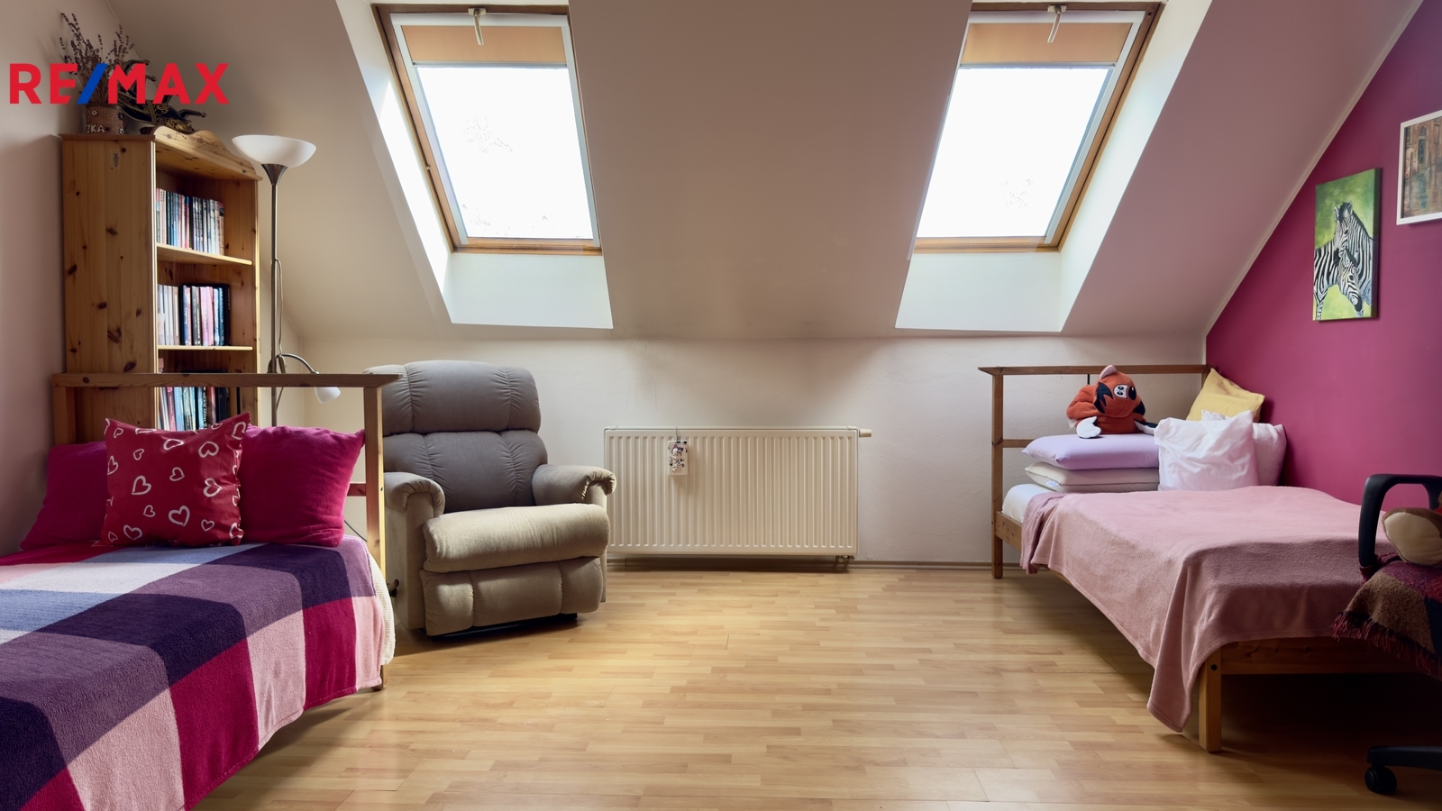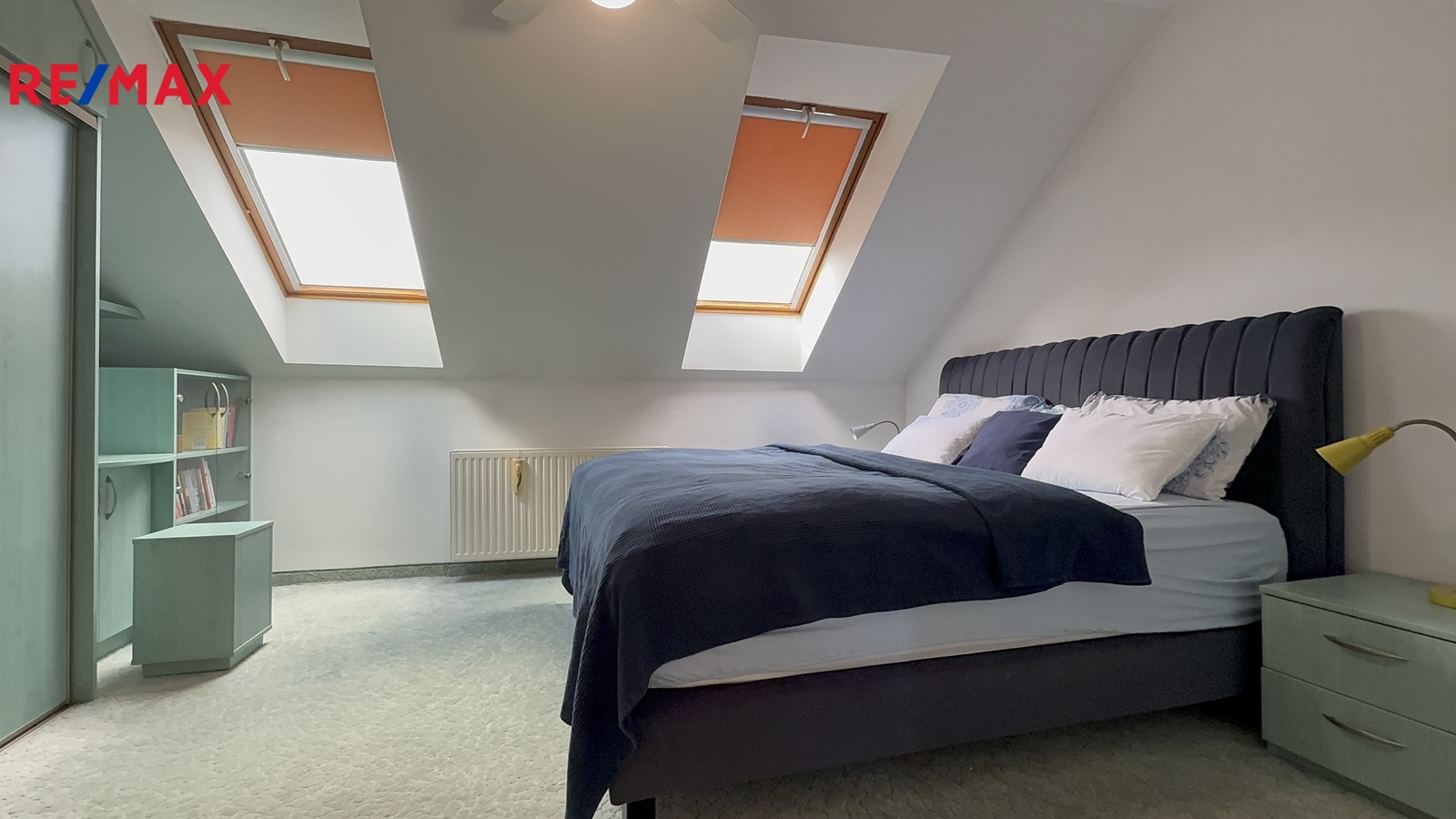 Po schodech z chodby se dostaneme do patra, kde se nachází prostor vyhrazený pro soukromí a odpočinek: dva samostatné pokoje ( ložnice s vestavěnou skříní a dětský pokoj či pracovna taktéž s vestavěnou skříní ) a dále koupelna s toaletou. O celkový tepelný komfort se stará plynový kondenzační kotel, který zajišťuje jak vytápění, tak i ohřev vody. Dům byl kolaudován v roce 2003, je ve velmi dobrém technickém stavu a nevyžaduje další nutné investice – stačí se nastěhovat a bydlet.