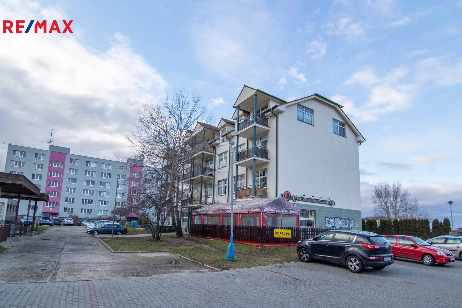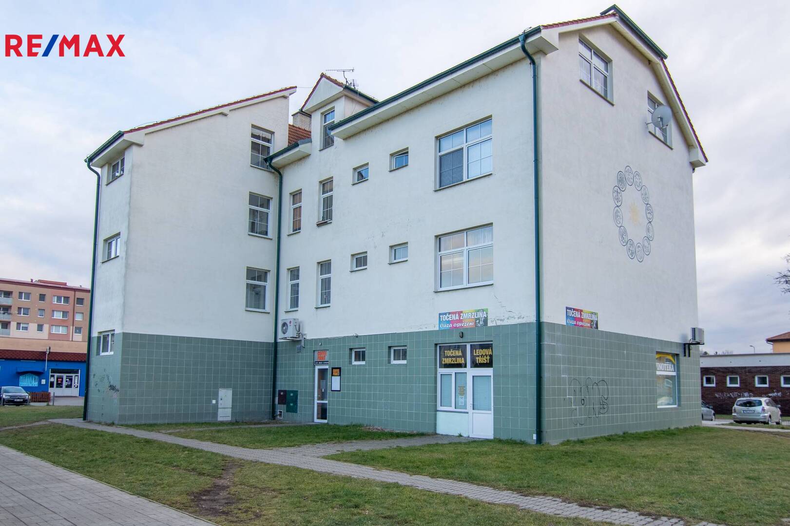 V přízemí hospoda (byt orientován na opačnou stranu), kavárna, kousek od domu PENNY, bankomat.