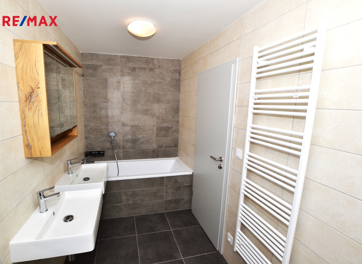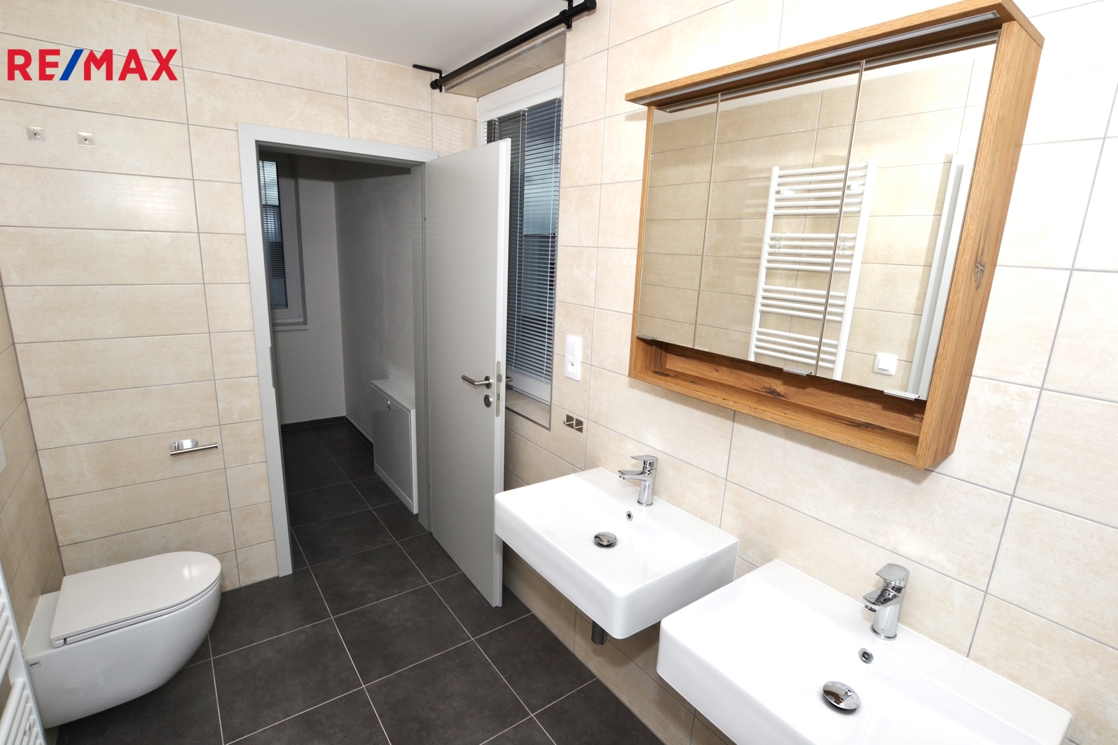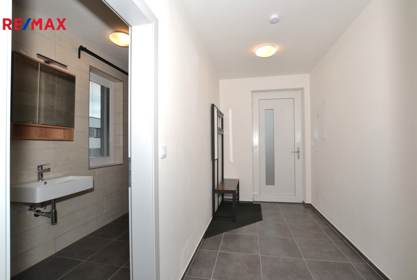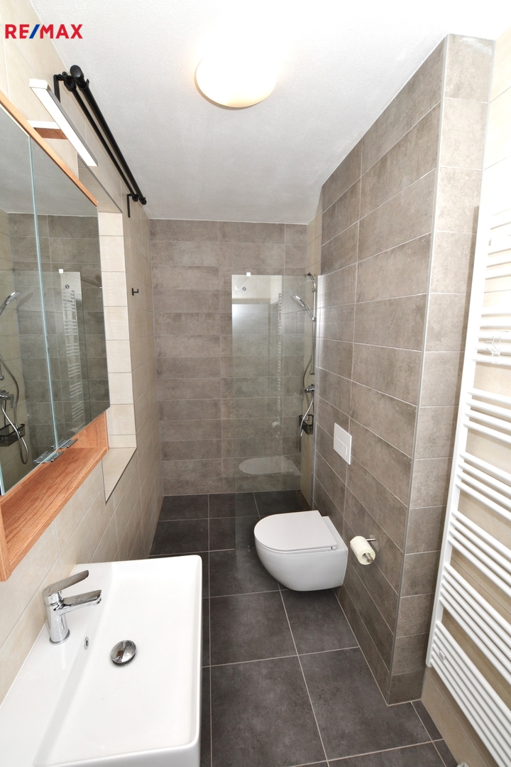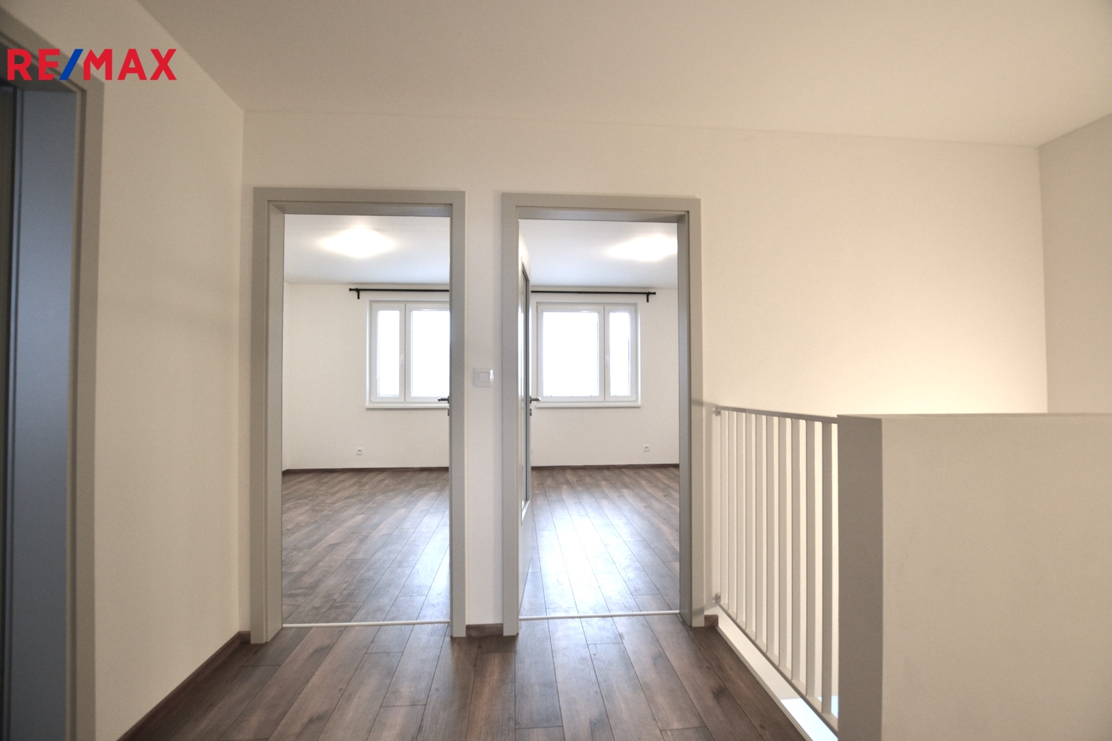 V patře jsou další tři pokoje, vzájemně neprůchozí, každý se vstupem z chodby, dále pak koupelna s vanou, toaletou a dvěma umyvadly. Za koupelnou se nachází místnost s řídící jednotkou a zásobníkem vody tepelného čerpadla pro vytápění a ohřev vody, zde je i možno instalovat pračku se sušičkou prádla.