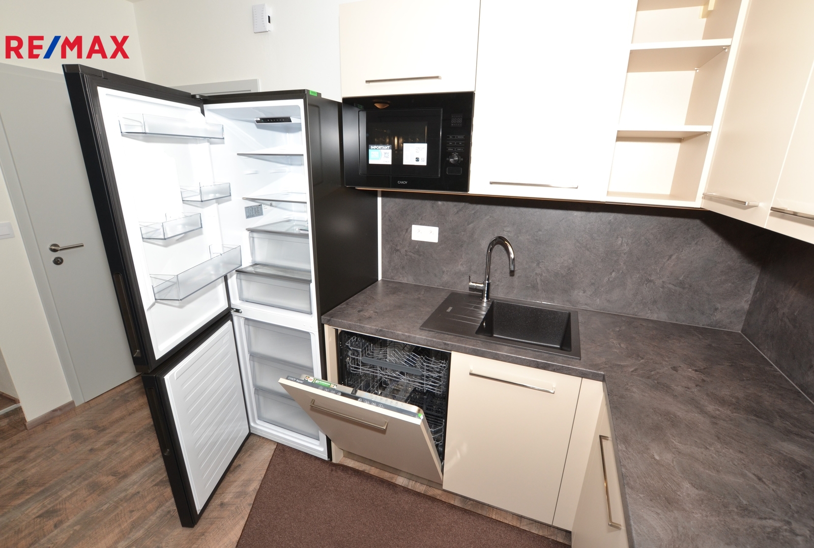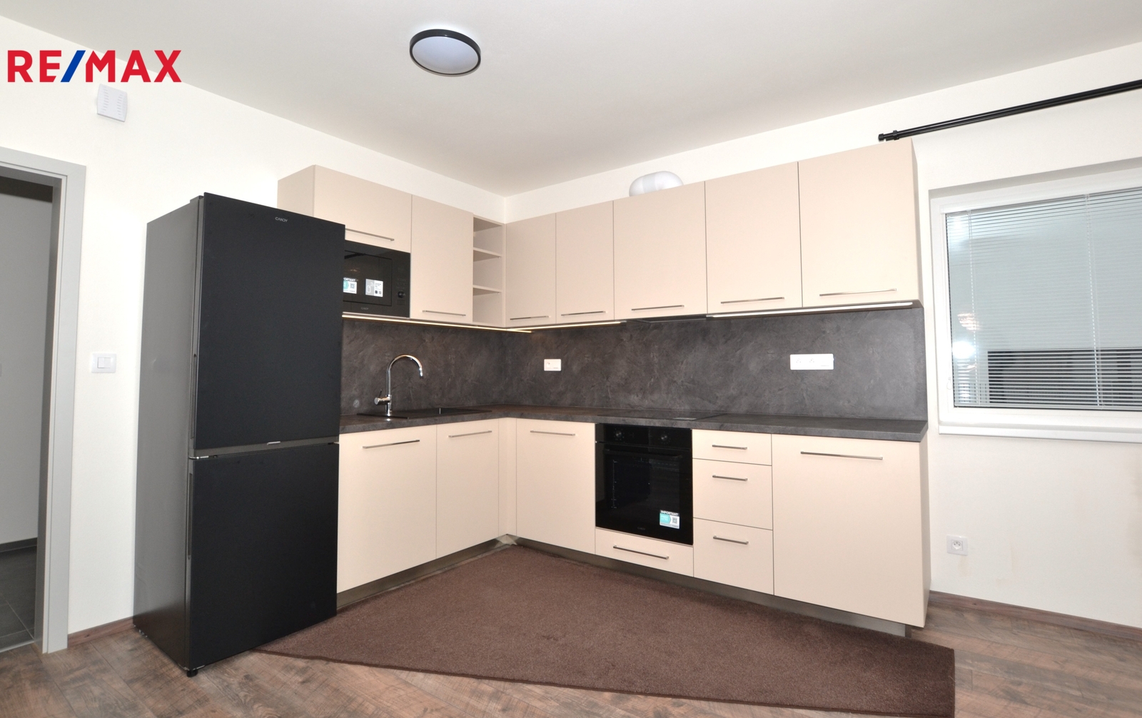 Moderní kuchyňská linka je včetně vestavěných spotřebičů - indukční el. varné desky, multifunkční el. trouby, mikrovlnné trouby, myčky nádobí a k dispozici je lednice s mrazákem.