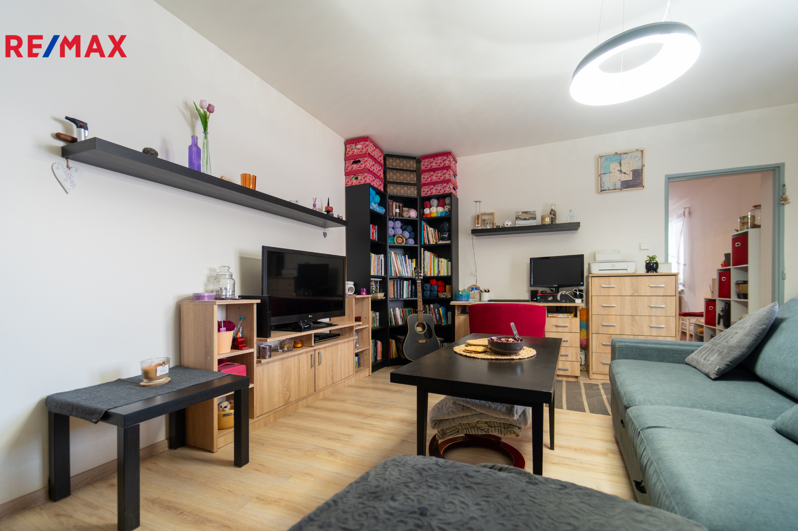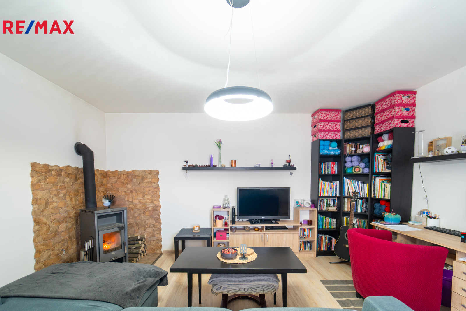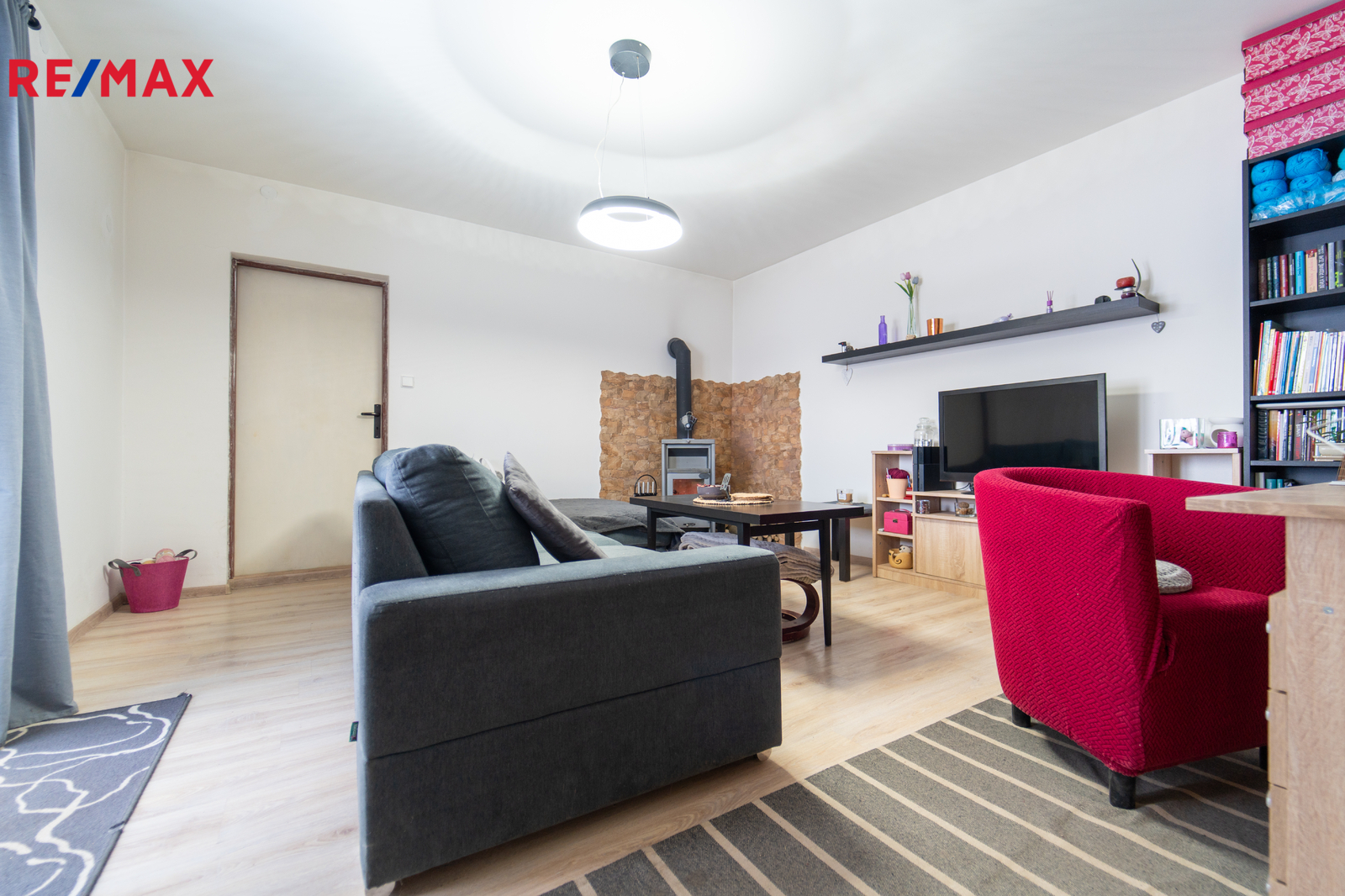 Z kuchyně plynule vstoupíte do obývacího pokoje (19,94 m²), kde vás potěší nejen útulná atmosféra, ale také francouzské okno vedoucí přímo na zahradu a krbová kamna. Z obývacího pokoje je dále vstup do dalšího pokoje, který je v současnosti využíván jako praktický úložný prostor, ale může sloužit jako dětský pokoj, pracovna nebo pokoj pro hosty. Z kuchyně se také vstupuje do koupelny (4,94 m²), kde se nachází plynový kotel, který zajišťuje teplo a ohřev vody.