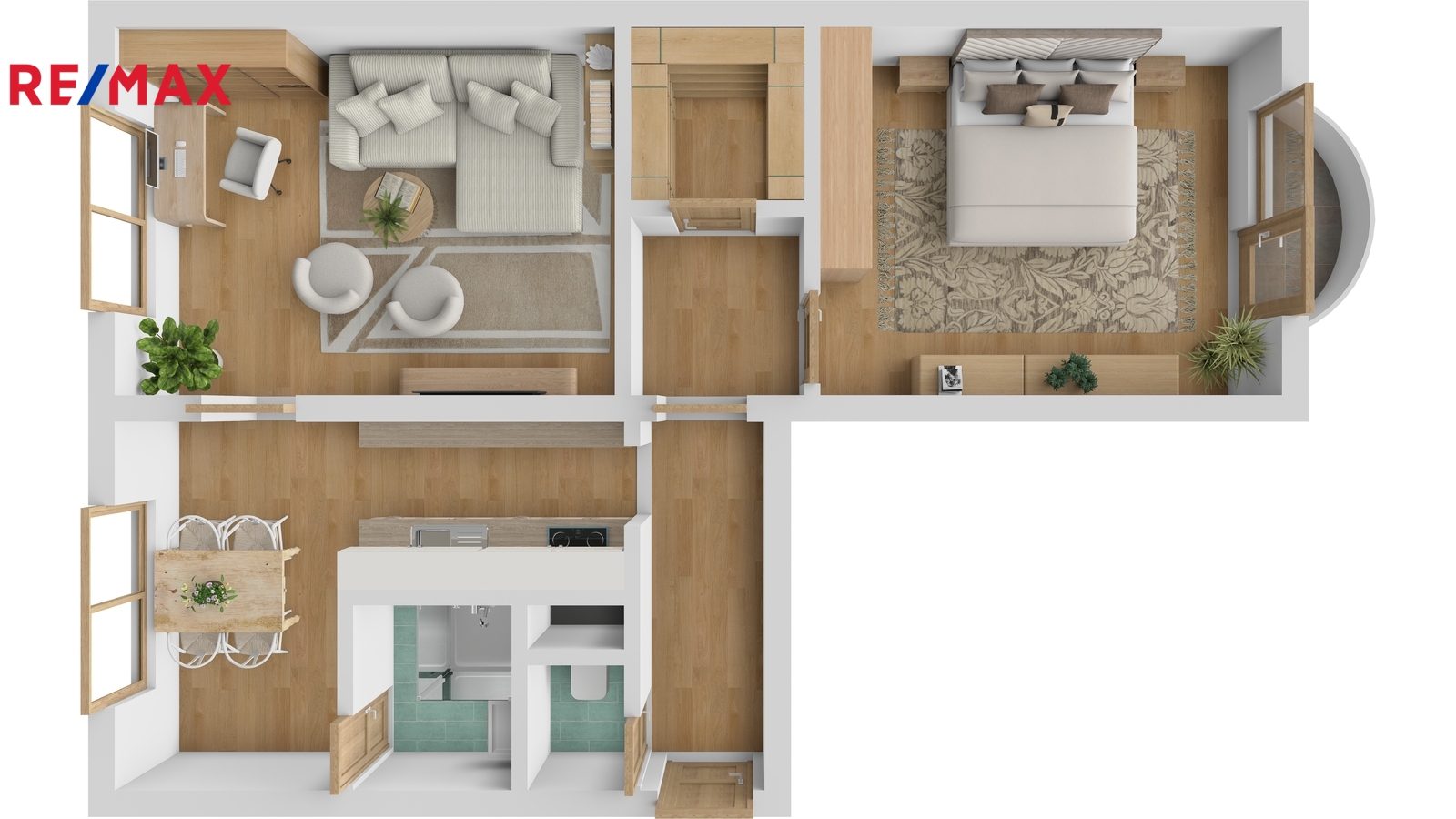 Velkou výhodou je rekonstruované bytové jádro z roku 2014 s koupelnou se sprchovým koutem, umyvadlovou skříňkou a samostatnou toaletou. Dispozice bytu je praktická a poskytuje dostatek úložného prostoru – v předsíni se nachází věšáková stěna a navazující šatna, kterou lze využít i jako menší komoru.