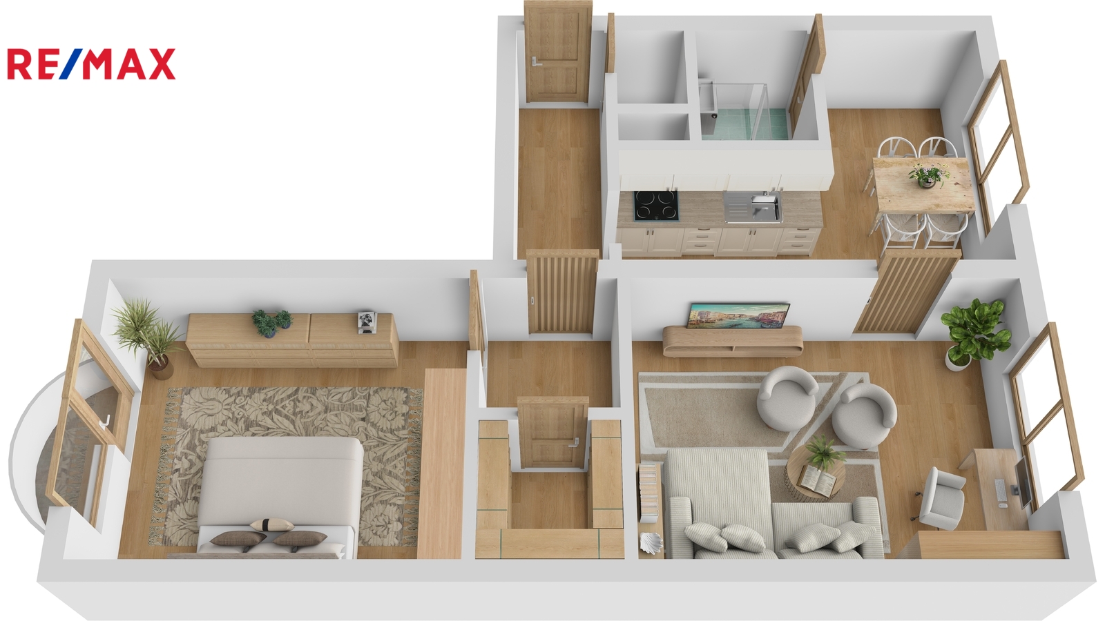 Kuchyně s jídelním koutem je orientována na východní stranu a vybavena kuchyňskou linkou s plynovým sporákem a digestoří. Na východ směřuje také obývací pokoj, který působí vzdušně a nabízí příjemný prostor pro odpočinek. Ložnice je orientována na západ a má přístup na balkon – ideální místo pro chvíle odpočinku při západu slunce.