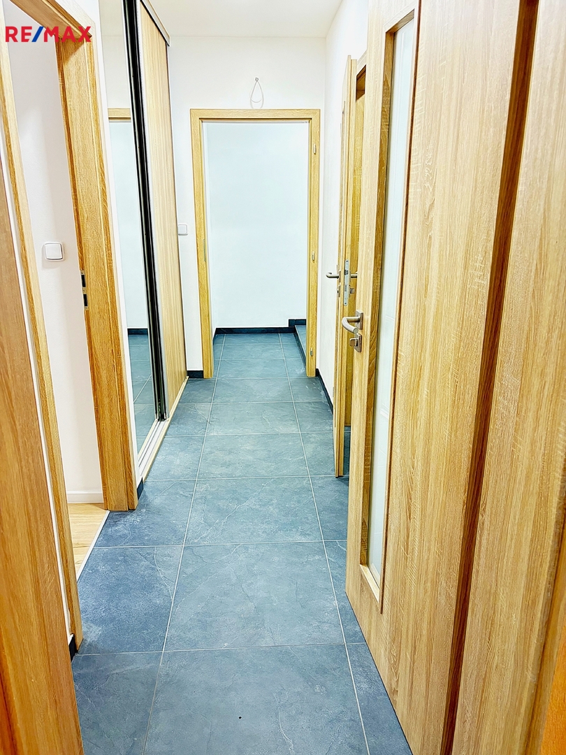 Byt má praktickou a pohodlnou dispozici – obývací pokoj s kuchyňským koutem, samostatnou ložnici a koupelnu s WC. Kuchyňská linka je vybavena moderními spotřebiči včetně myčky nádobí, mikrovlnné trouby, digestoře a indukční varné desky. Interiér je světlý, vzdušný a připravený k okamžitému nastěhování.