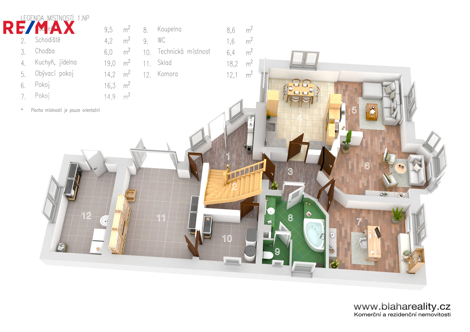 Přízemí o orientační výměře 122 m² nabízí kuchyni s jídelnou, obývací pokoj a dva další pokoje. Dále je zde koupelna s podlahovým vytápěním, samostatné WC, sklad, chodba, kotelna a prádelna. Silné obvodové zdi o šířce 40 až 50 cm přispívají k výborné tepelné stabilitě, v zimě drží teplo a v létě pomáhají udržovat příjemné klima.
