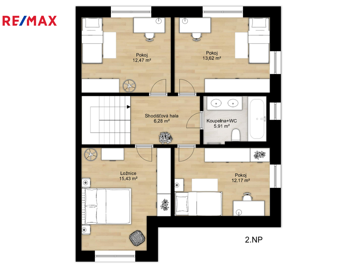 2. NP (66 m²): Klidová zóna se čtyřmi samostatnými pokoji (ložnice + 3 dětské pokoje/pracovny) a prostornou rodinnou koupelnou.