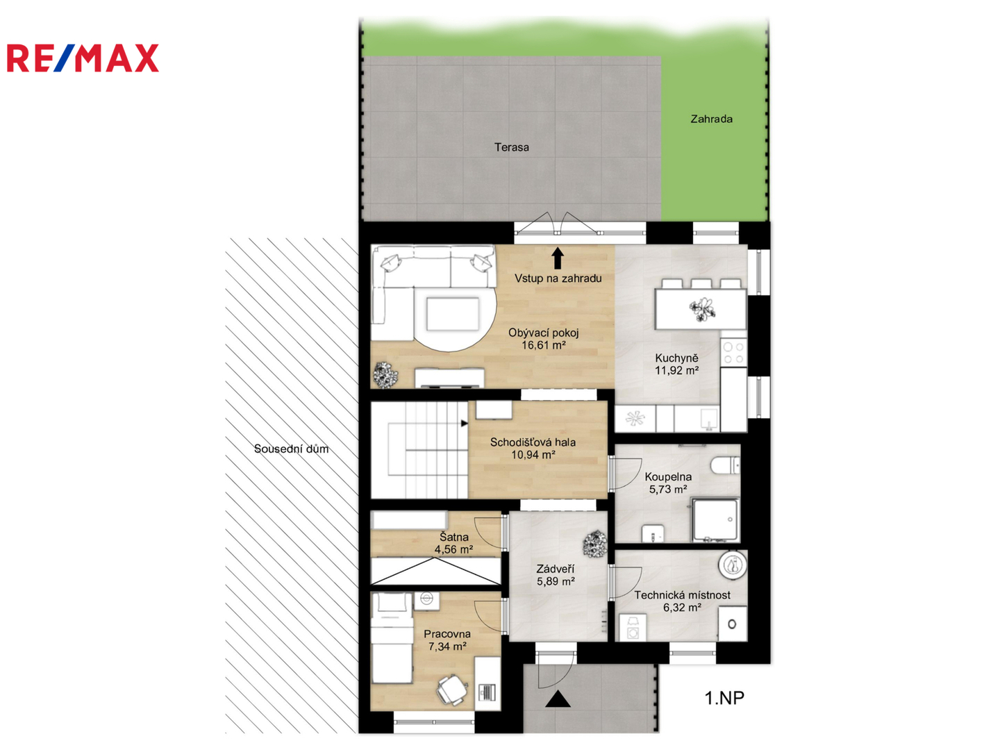 1. NP (68 m²): Světlý obývací pokoj s kuchyňským koutem a vstupem na pobytovou terasu, pracovna/hostinský pokoj, šatna, koupelna, technické zázemí a zádveří.