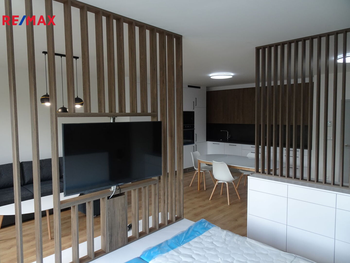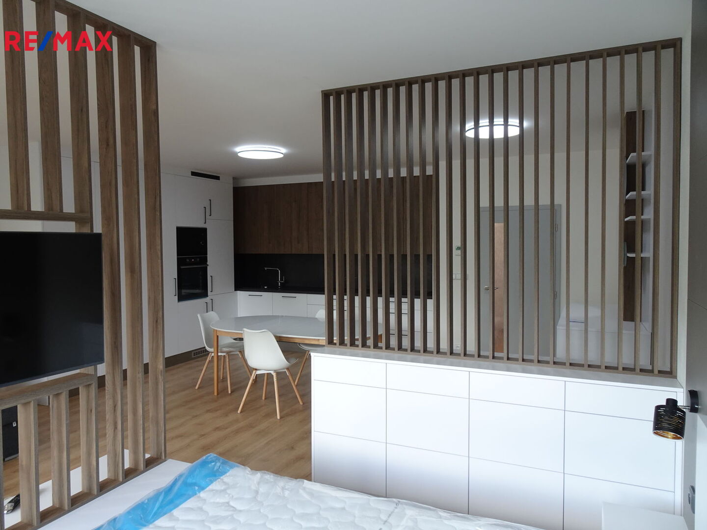 Užitná plocha bytu činí 58m2, z toho obytná 48m2, byt je kompletně a designově vybavený, jak je patrno z fotogalerie, k dispozici je prostorné zádveří - chodba a vestavěnými šatními skříněmi, kompletně vybavená kuchyně, stolování, sedací souprava, otočná televize (umožňuje sledování jak z obývacího pokoje, tak prostoru pro spaní) a odstínění prostoru pro spaní od prostoru pro denní užívání bytu designově navrženým nábytkem, který kromě této funkce plní též funkci úložnou, v bytě je úložných prostorů, důmyslně zakomponovaných opravdu dostatek. V celém bytě je naistalováno dálkově ovládané ambientní osvětlení, okno do ulice a balkonové dveře kryjí elektricky ovládané předokenní žaluzie.
