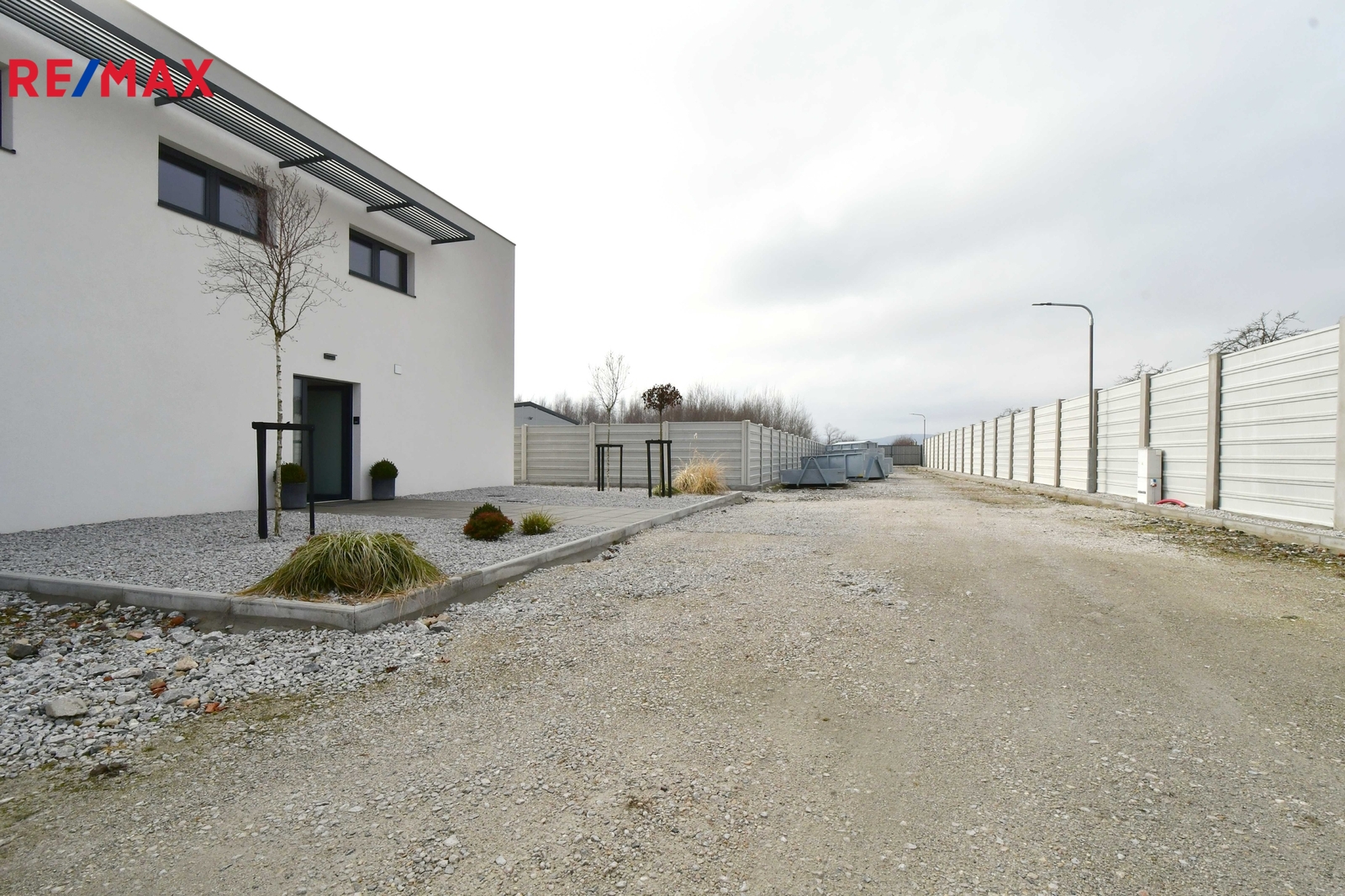 Samostatný vjezd do uzavřeného areálu elektricky ovládanou bránou, parkovací plocha (velikost pronajímaného pozemku cca 600 m2).
