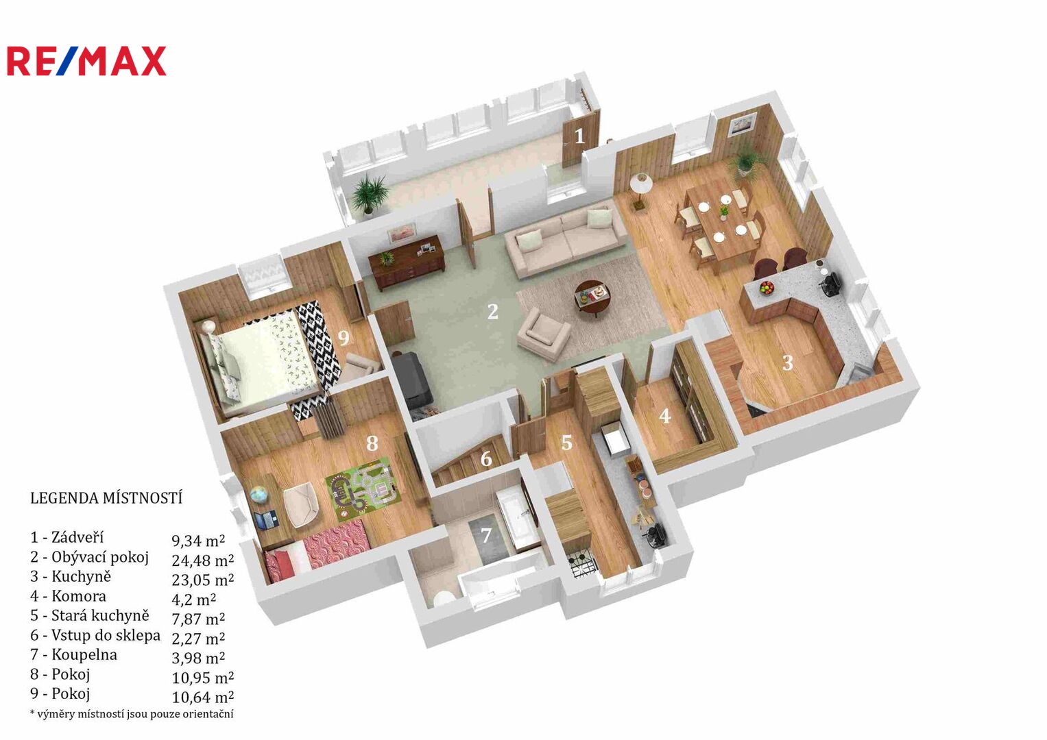 Chata o velikosti 3+1 má užitnou plochu 96 m2. Je tvořena prostorným obývacím pokojem 24,5 m2, kuchyní 23 m2, dvěma ložnicemi 11 m2+ 10,5 m2, koupelnou s vanou a toaletou, prostorným zádveřím, komorou.