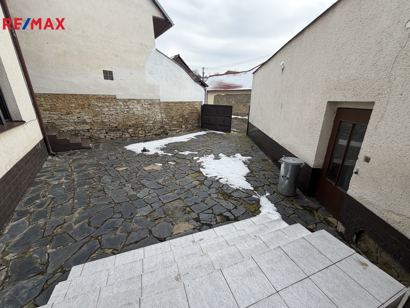 Zpevněná plocha před domem je uzavřená a slouží pro posezení venku.