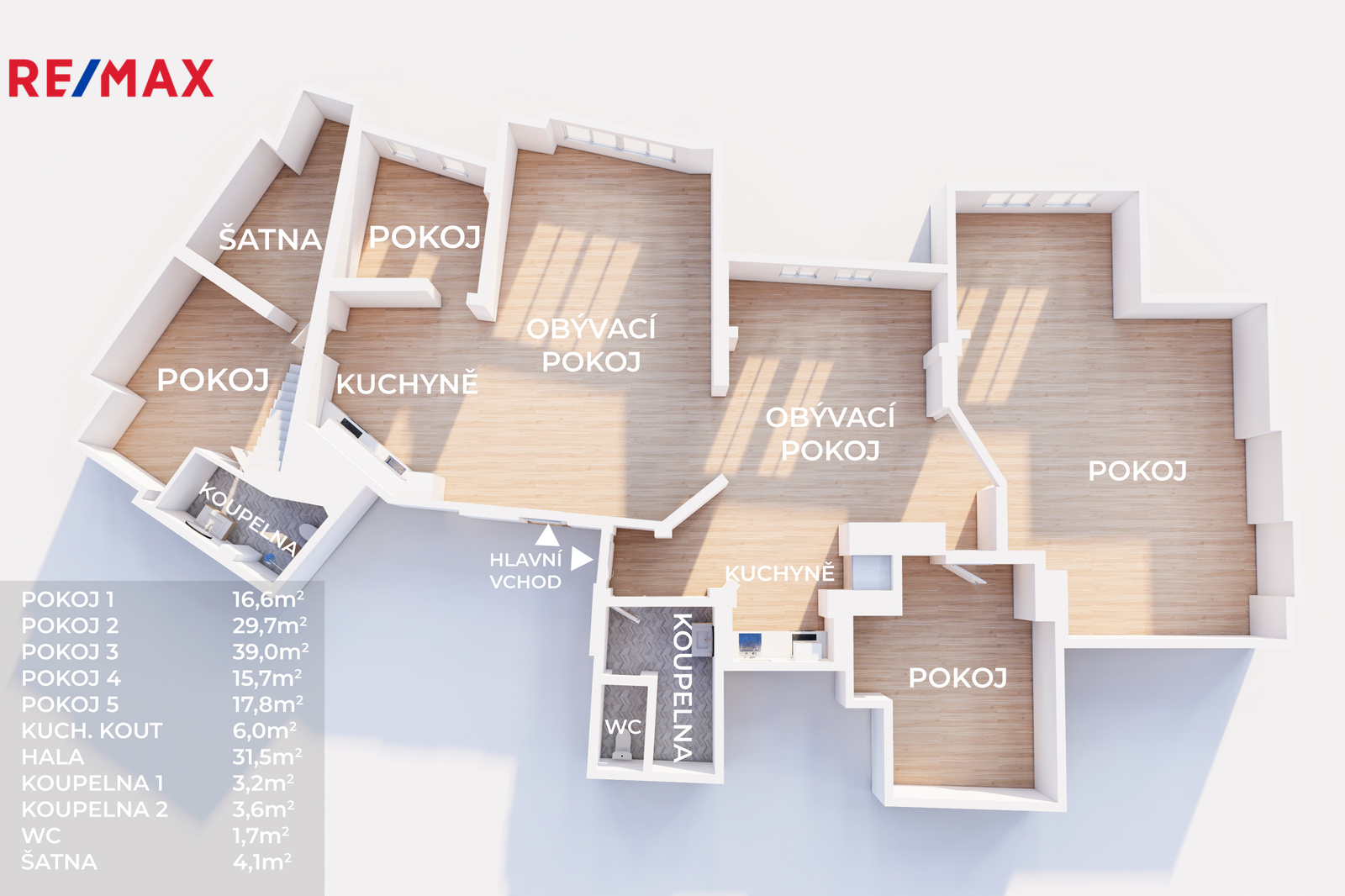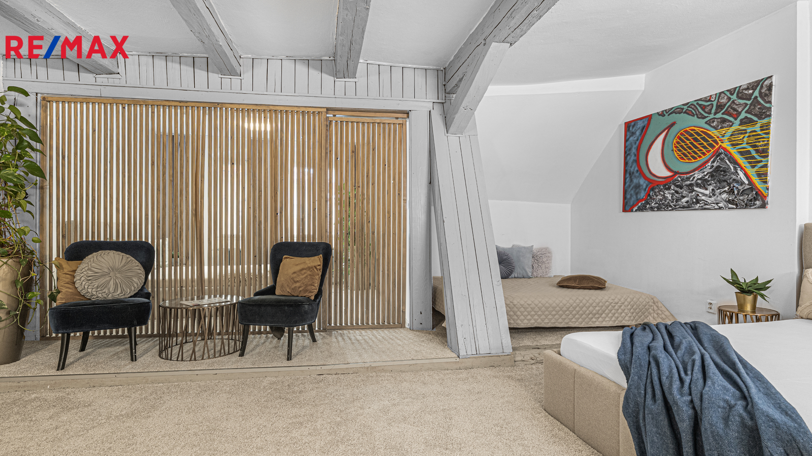 Interiér je definován přiznanými trámy, podkrovní architekturou a promyšleným členěním, které přirozeně vytváří reprezentativní společenský prostor i klidové zóny. Hlavní obytná část plynule navazuje na jídelní část a kuchyň, zatímco samostatné ložnice, koupelny a další prostory poskytují komfort pro vlastní bydlení i ubytování hostů.
