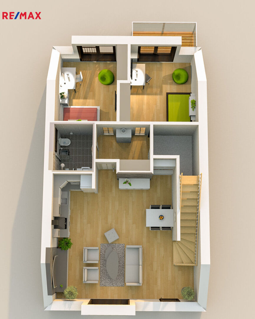 V 1.NP tohoto mezonetového bytu vás přivítá prostorná vstupní chodba o velikosti 13,2 m², která nabízí dostatek místa pro úložné prostory a poskytuje přístup do všech částí bytu. Hlavní obytný prostor o rozloze 31,4 m² zahrnuje světlý obývací pokoj s kuchyňským koutem, který je ideálním místem pro rodinné setkání a společné chvíle. Velká okna zajišťují dostatek denního světla a vytvářejí příjemnou atmosféru po celý den. Byt dále disponuje dvěma samostatnými pokoji o velikosti 13,4 m² a 16,2 m², které lze využít přesně dle Vašeho uvážení. Mohou sloužit jako dětské pokoje, pracovny, ložnice pro hosty či fitness místnost. Z většího pokoje je přímý vstup na balkon, který poskytuje krásný výhled do zeleně a nabízí místo pro relaxaci či posezení na čerstvém vzduchu. Koupelna s vanou je ideálním místem pro relaxaci, zatímco samostatné WC přináší praktický komfort pro každodenní život.