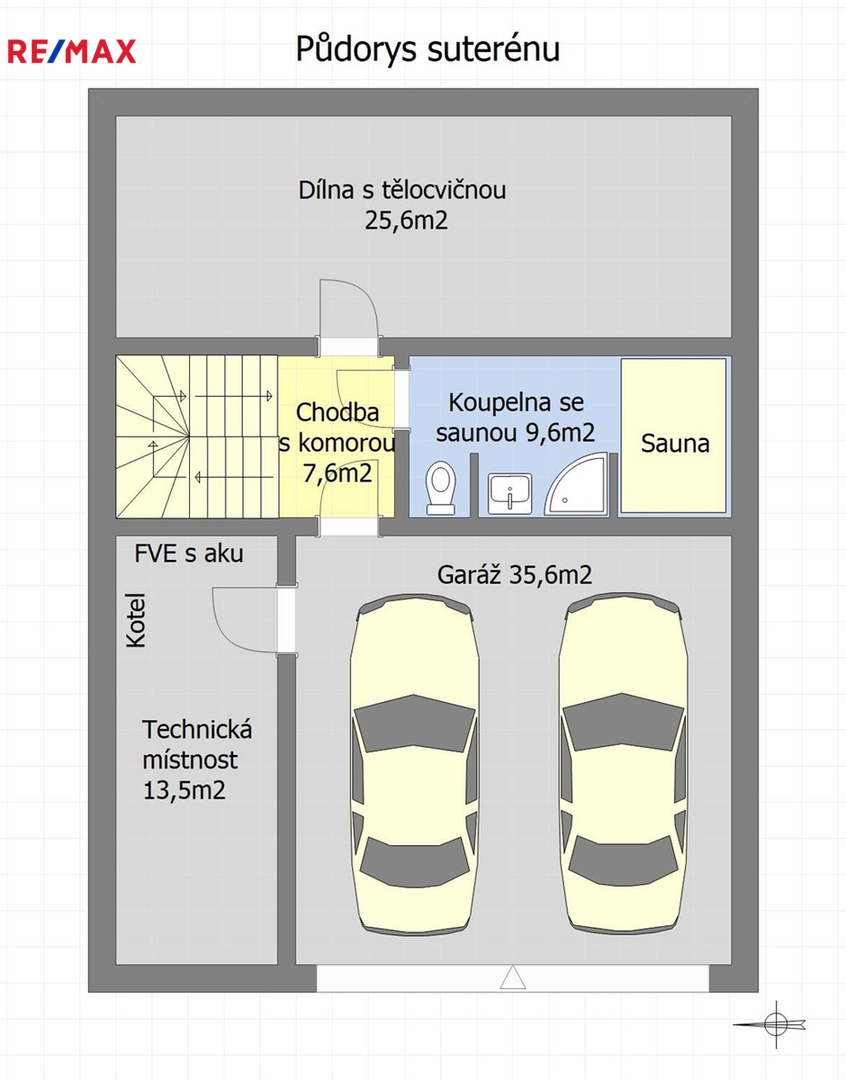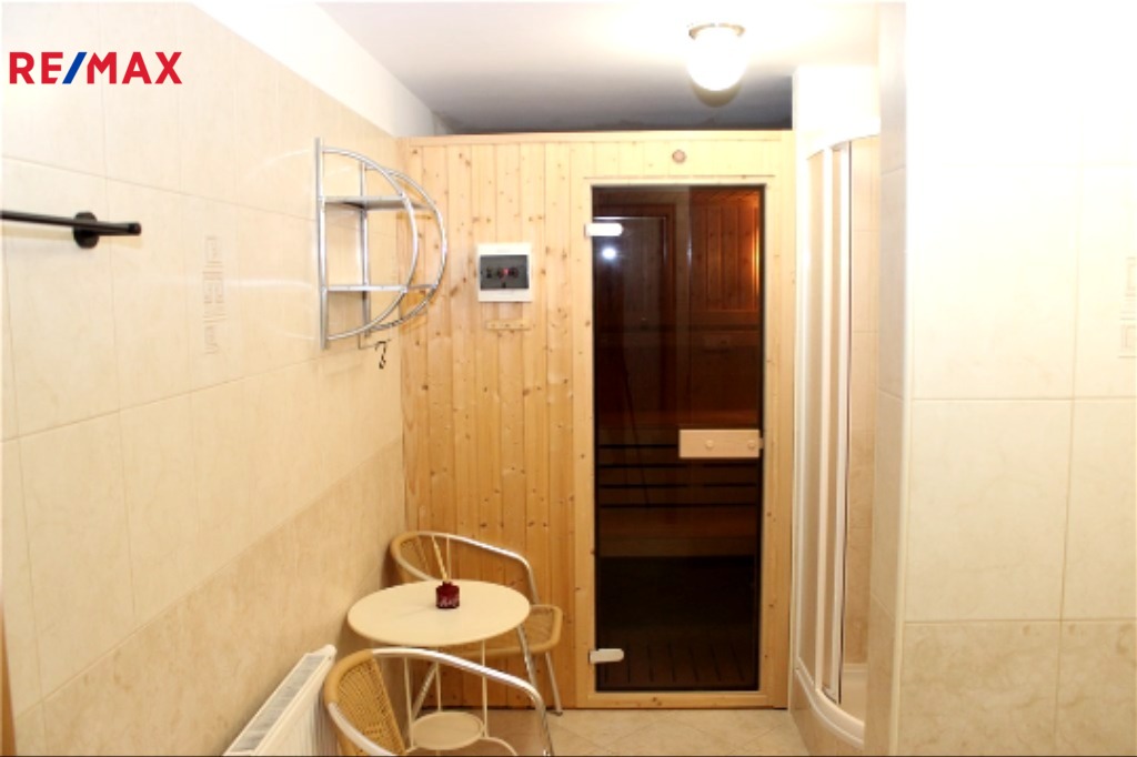 V suterénu se nachází garáž pro 2 vozidla, dílna s tělocvičnou, koupelna s WC a finskou saunou, sklad pod schodištěm a technická místnost (kondenzační plynový kotel, bateriové úložiště od fotovoltaické elektrárny).
