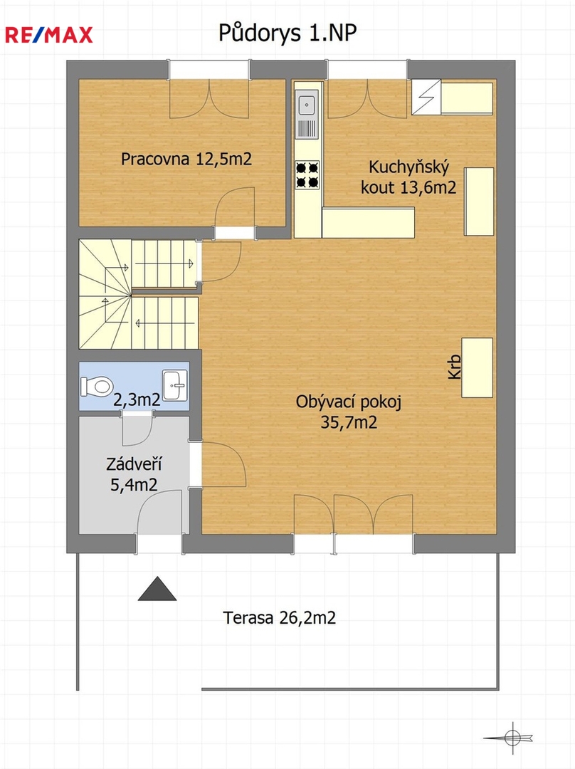 V 1.NP se nachází zádveří, WC s umyvadlem, pokoj (pracovna) se vstupem na zadní terasu, obývací pokoj s kuchyňským a jídelním koutem, krbem a vstupem na zadní a zastřešenou přední terasu. Kuchyňská linka od firmy Hanák je vybavena spotřebiči Siemens.