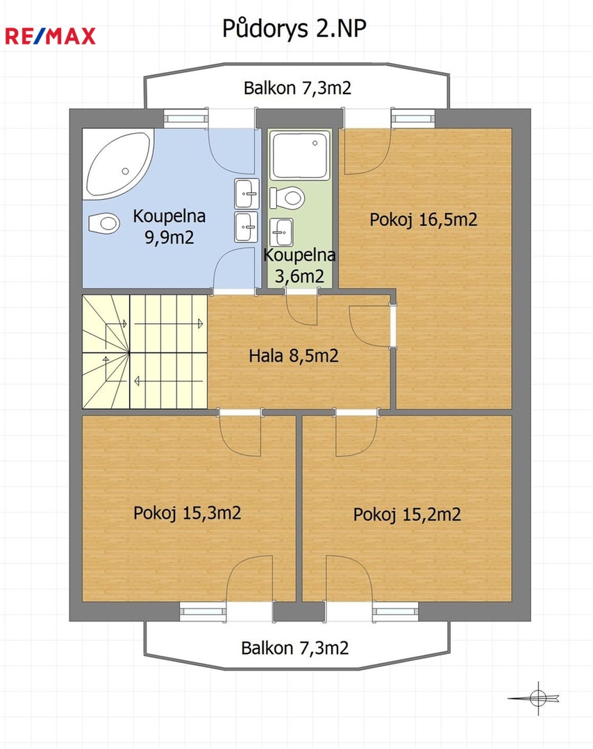 V 2.NP se nachází hala, 3 ložnice se vstupy na balkón, koupelna s rohovou vanou, bidetem, 2 umyvadly a vstupem na balkón, koupelna č. 2 se sprchovým koutem, WC a umyvadlem.