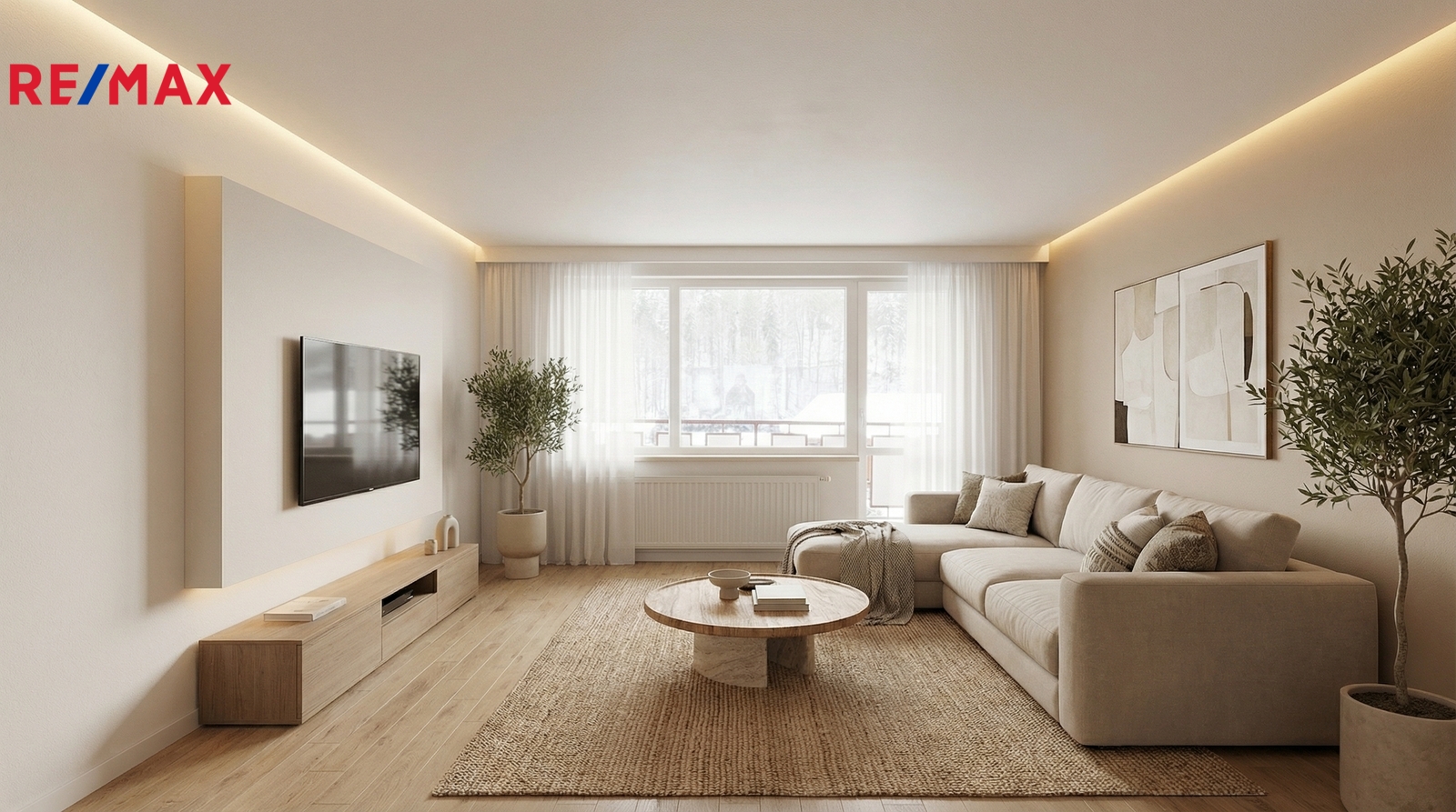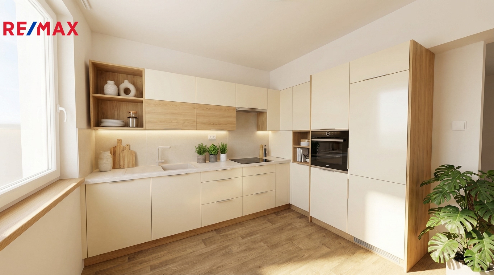 chodba, koupelna, komora, kuchyně, obývací pokoj se vstupem na balkon a ložnice