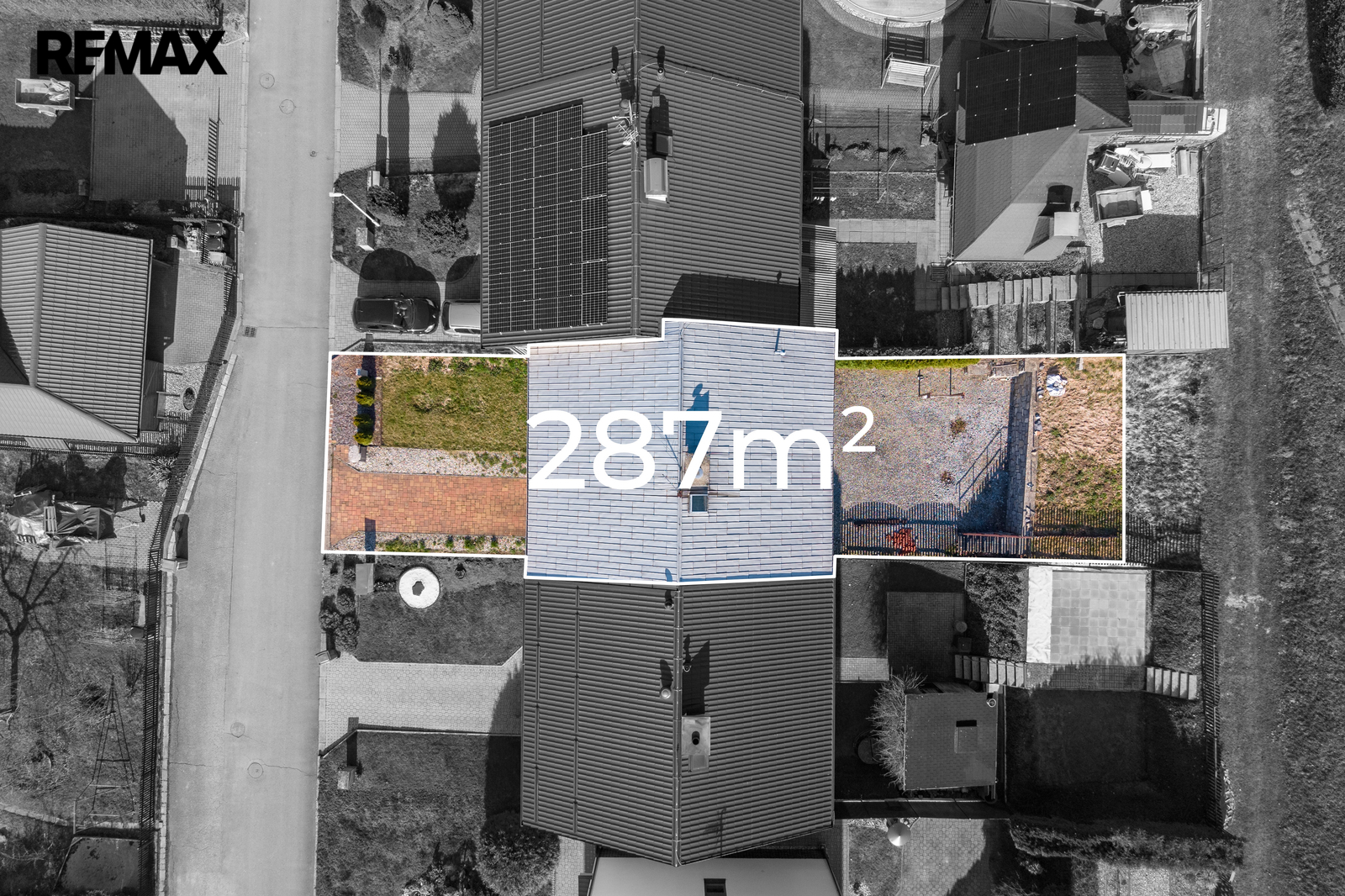 Celková výměra pozemku činí 287 m², zastavěná plocha 87 m². Parkování je zajištěno garáží integrovanou v domě a dvěma venkovními parkovacími místy.