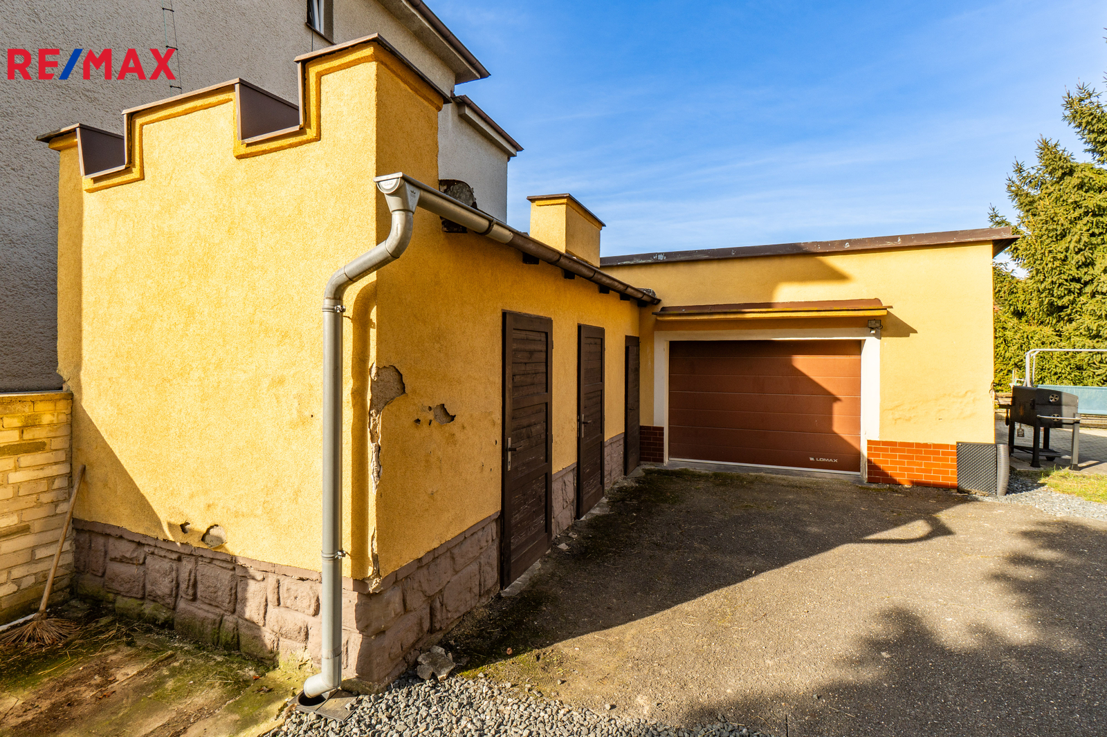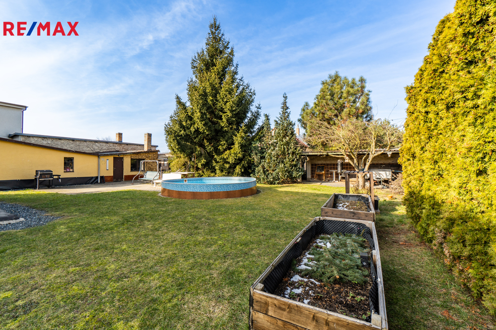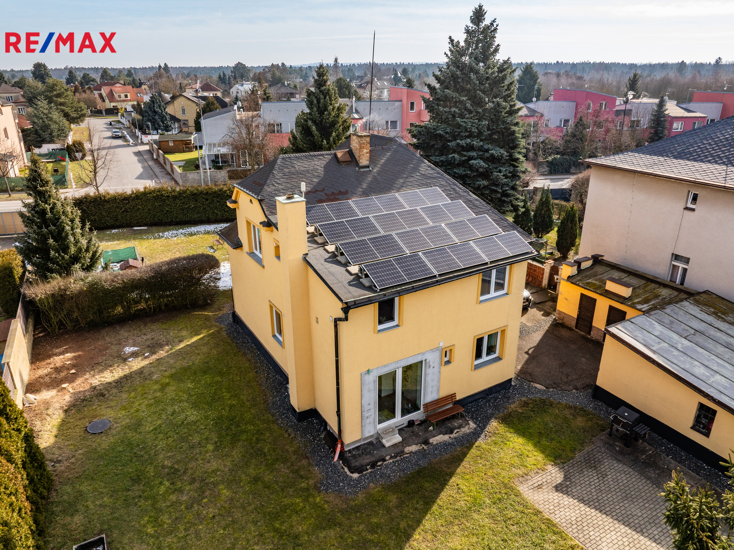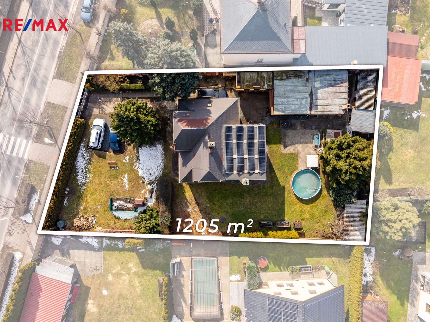 Dům je na pozemku situován s odstupem od hlavní komunikace. V přední části je příjezdová cesta s parkovací plochou pro 2 vozy a travnatá plocha se vzrostlou zelení. Za domem se nachází garáž pro jedno auto, dílna, hospodářské zázemí, kopaná studna a bazén. Pozemek o celkové výměře 1205 m² je tak přirozeně rozdělen na klidovou zónu s velkou mírou soukromí a přední užitnou část.