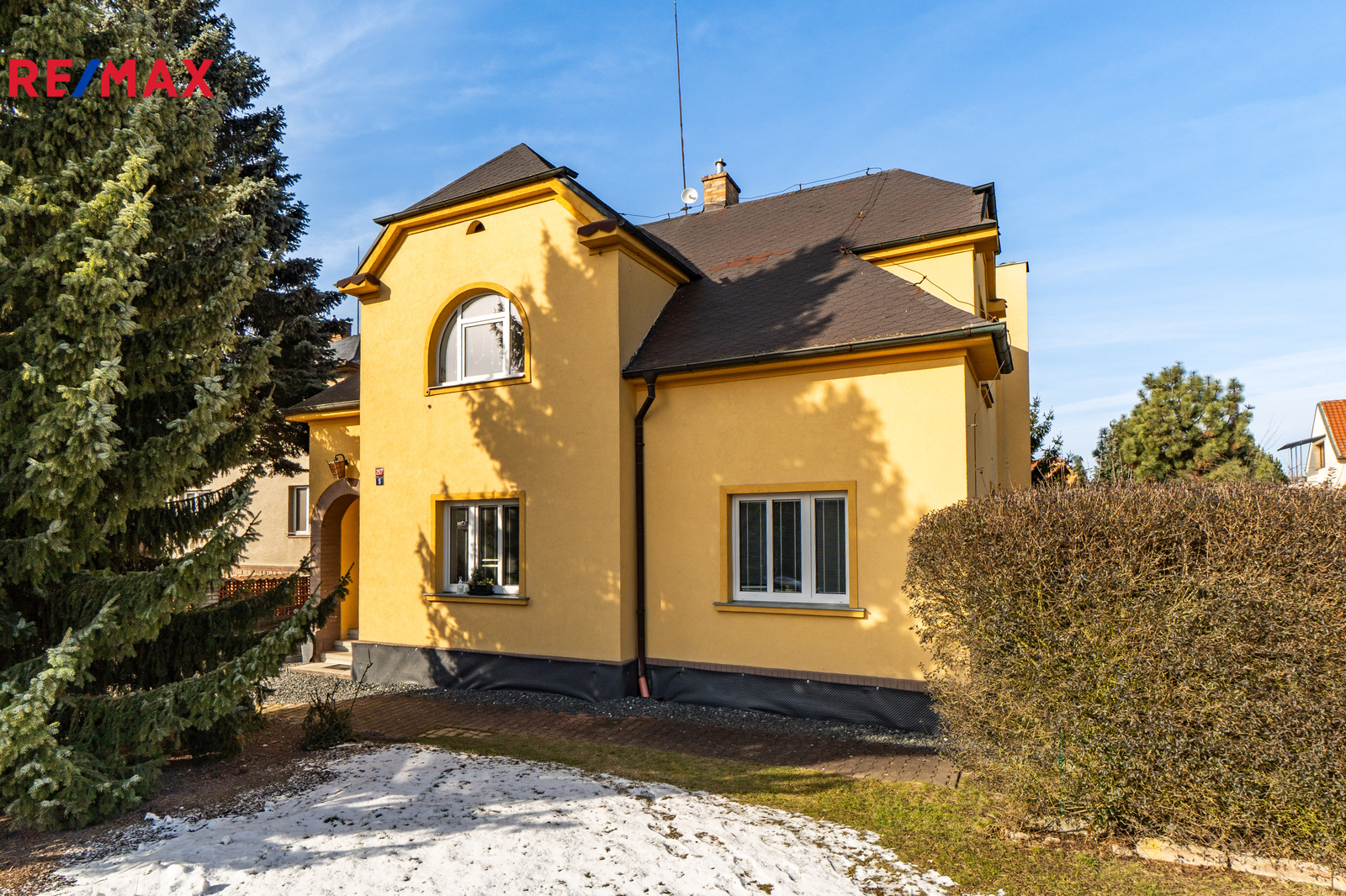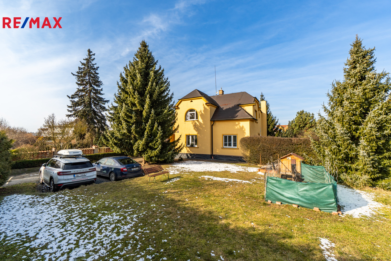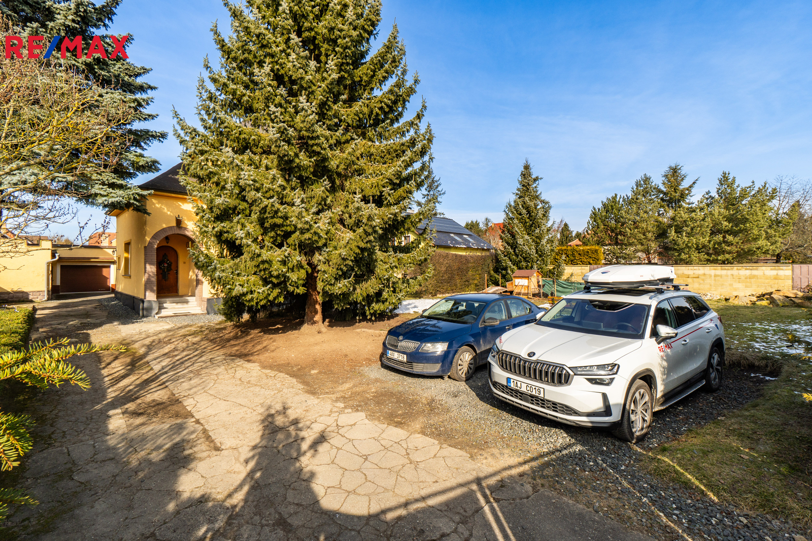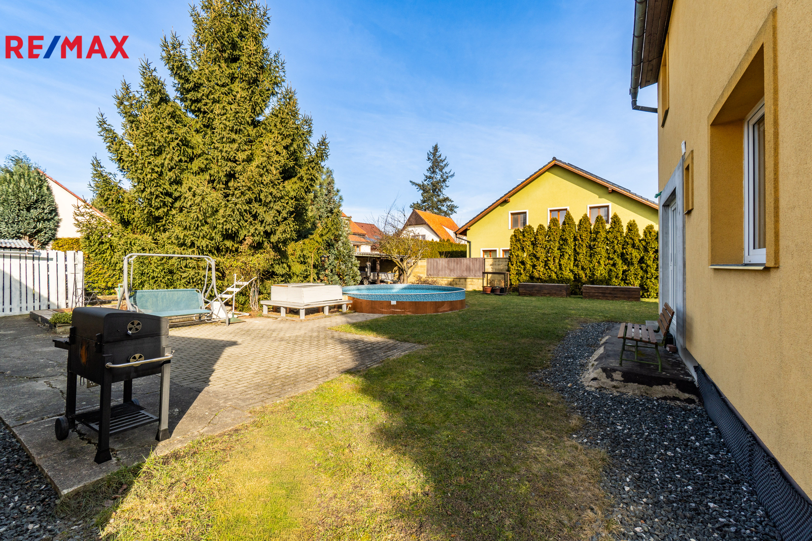 Dům je na pozemku situován s odstupem od hlavní komunikace. V přední části je příjezdová cesta s parkovací plochou pro 2 vozy a travnatá plocha se vzrostlou zelení. Za domem se nachází garáž pro jedno auto, dílna, hospodářské zázemí, kopaná studna a bazén. Pozemek o celkové výměře 1205 m² je tak přirozeně rozdělen na klidovou zónu s velkou mírou soukromí a přední užitnou část.