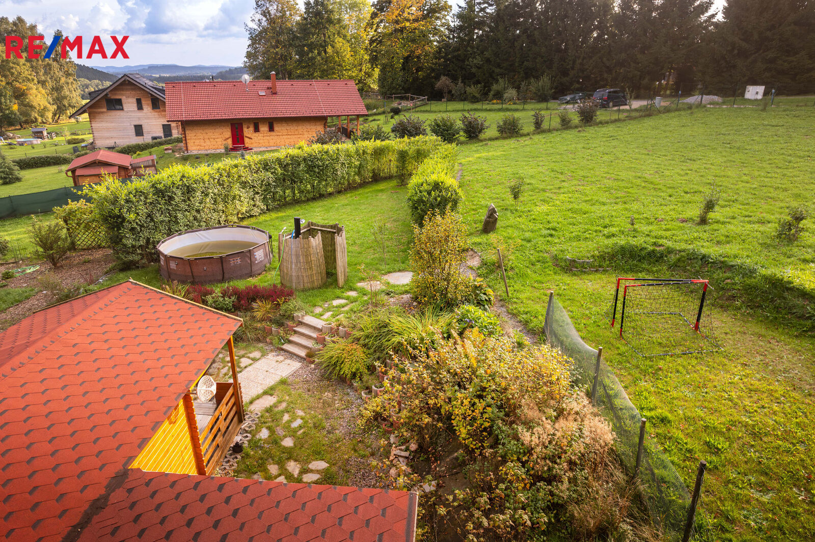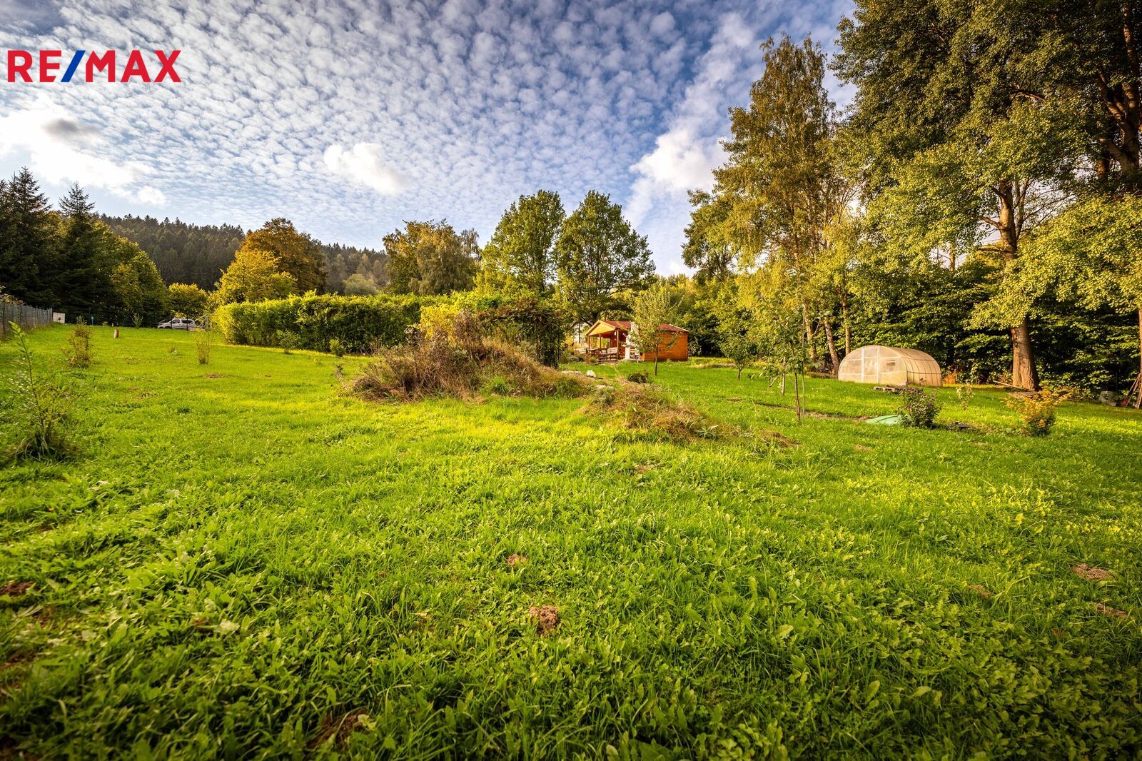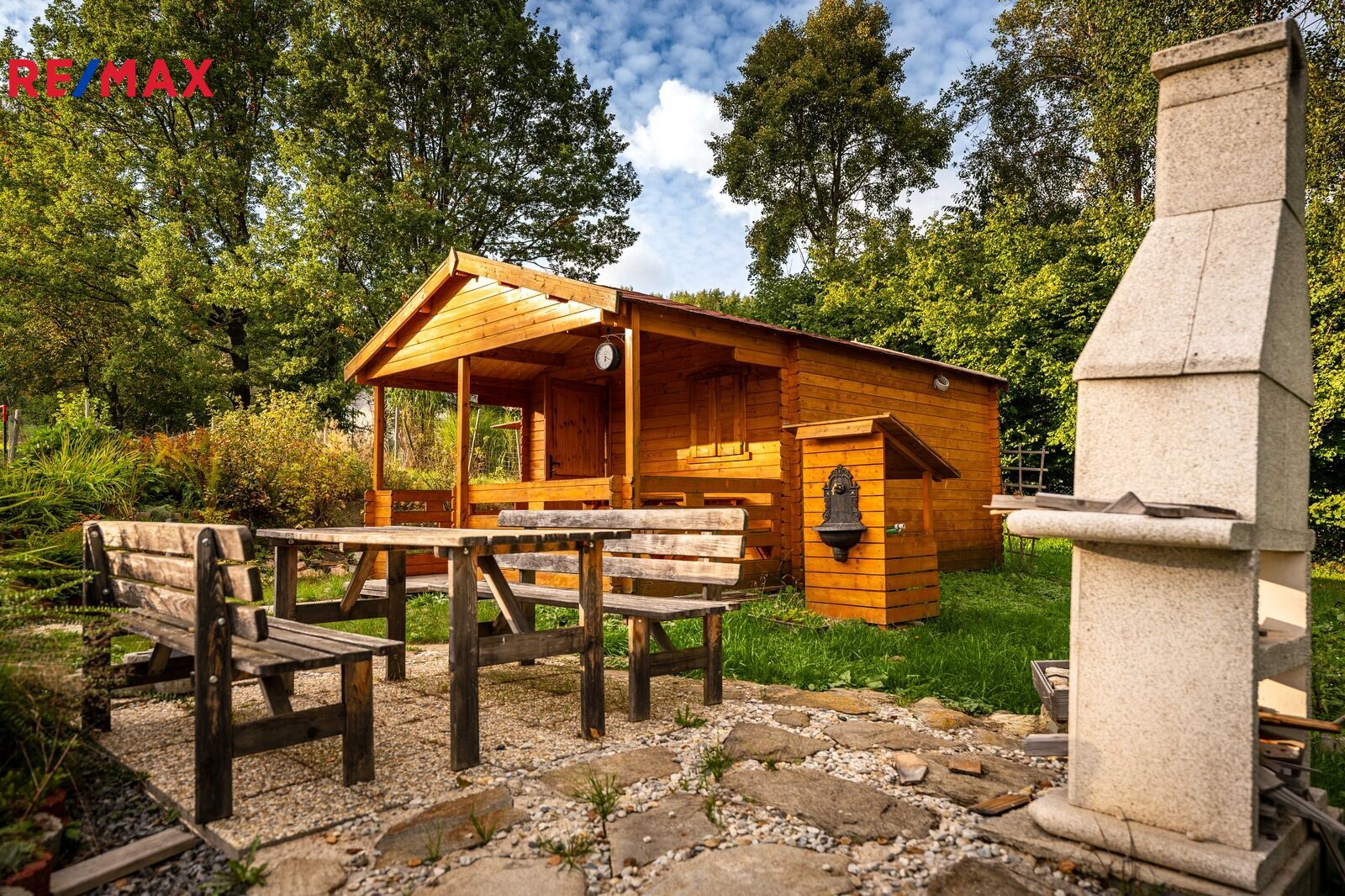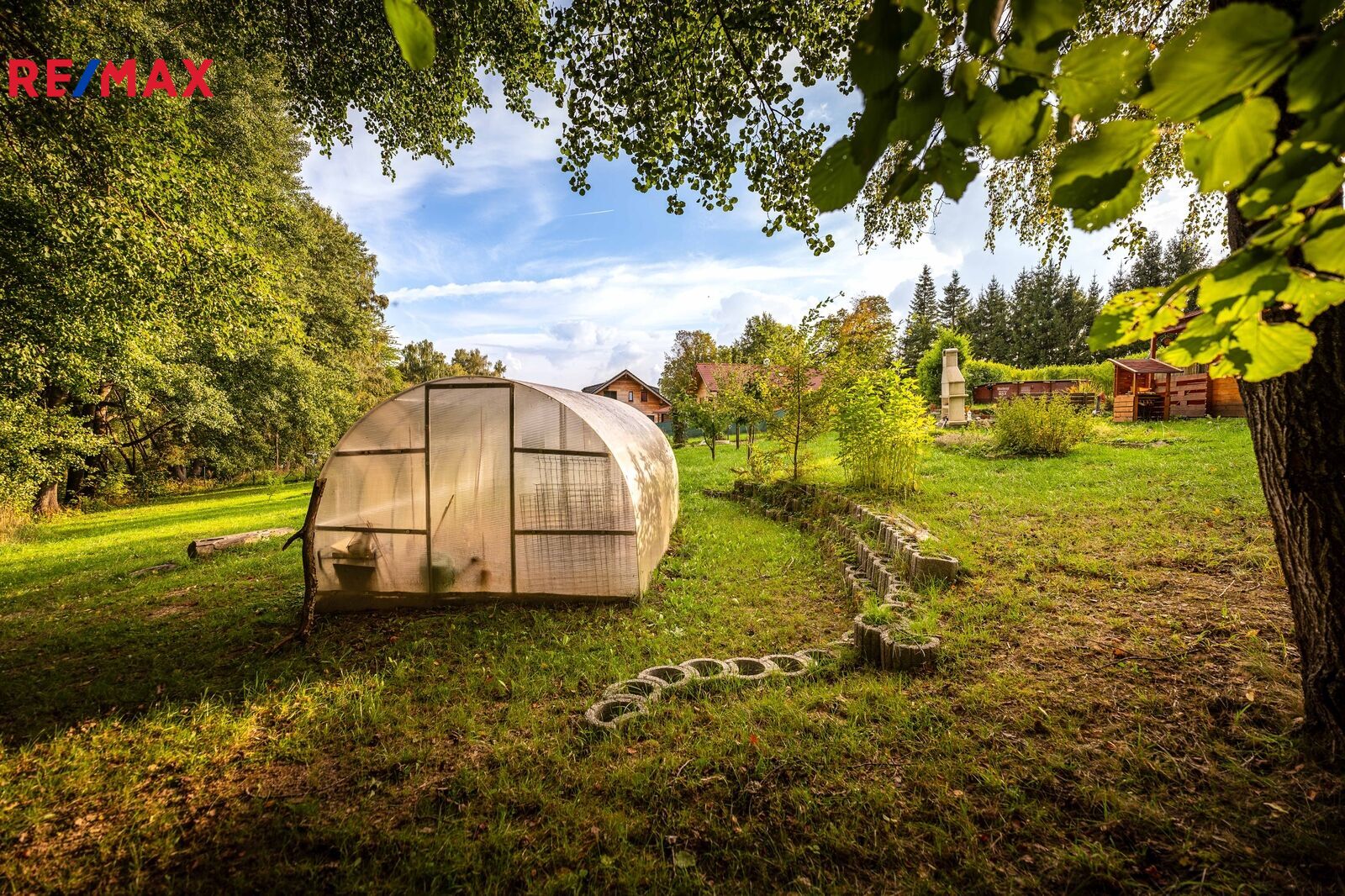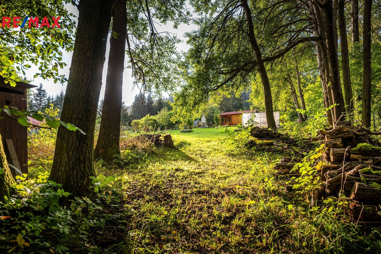 Na pozemku stojí menší dřevěná chatka, kterou lze využívat pro zázemí během pobytu nebo budoucí výstavby. Součástí je také přístřešek na nářadí. Upravená část zahrady nabízí venkovní posezení s krbem, bazénem a okrasnou výsadbou, zaručující soukromí na části rozlehlého pozemku.