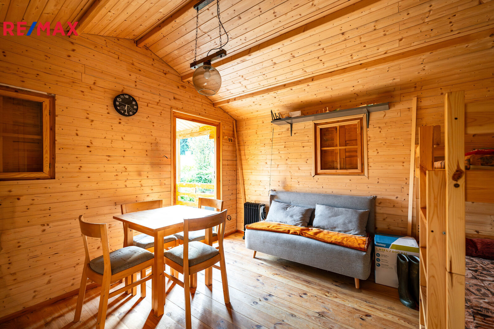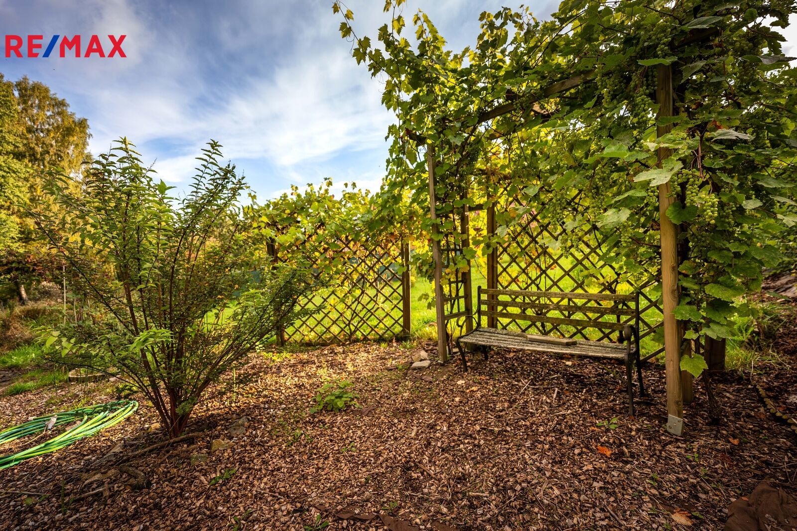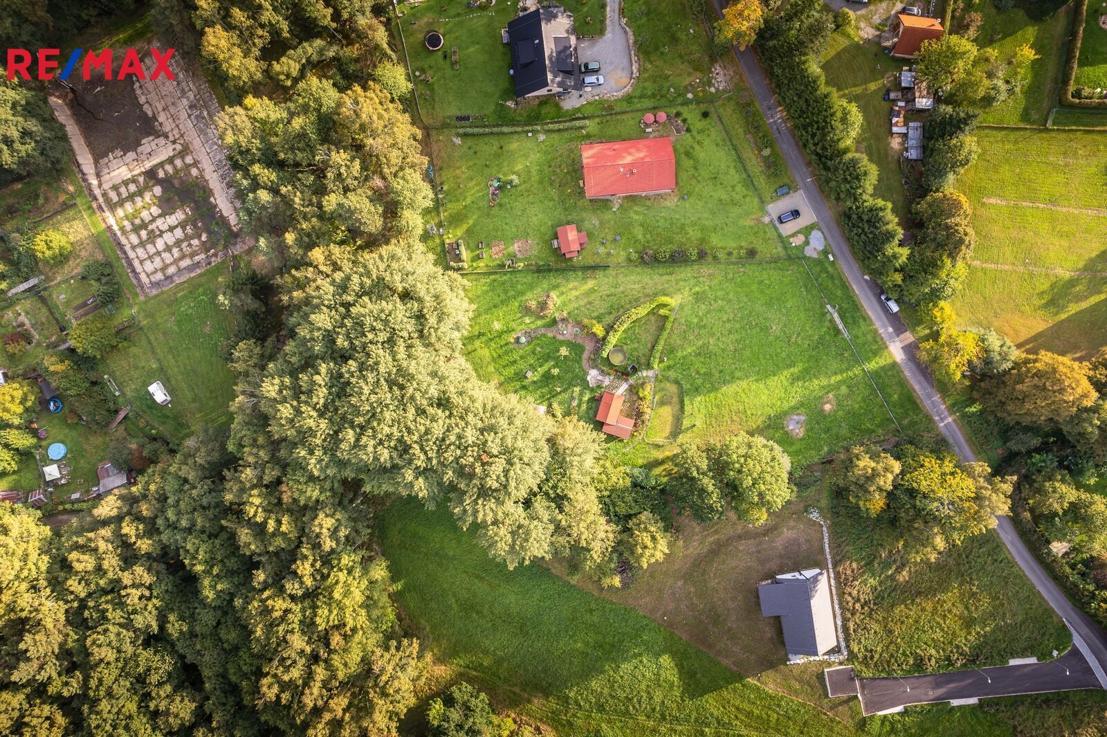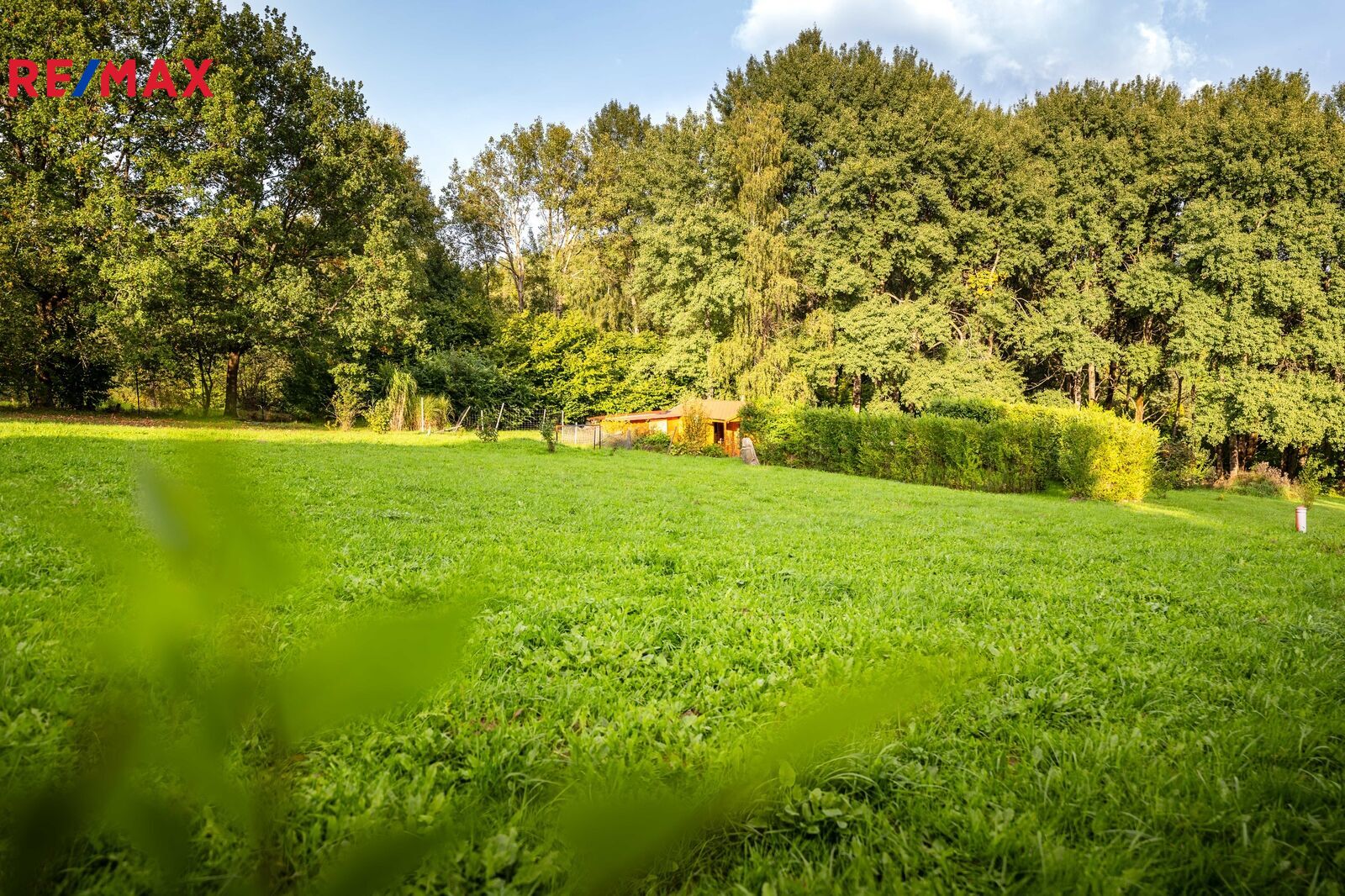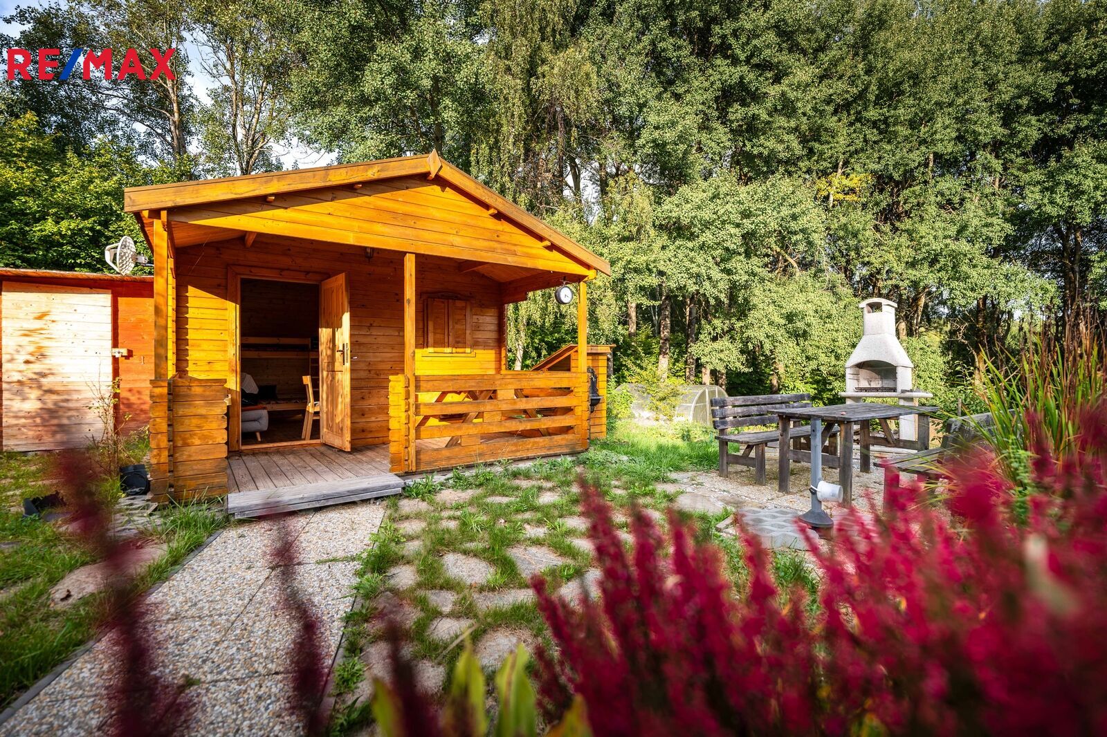 Na pozemku stojí menší dřevěná chatka, kterou lze využívat pro zázemí během pobytu nebo budoucí výstavby. Součástí je také přístřešek na nářadí. Upravená část zahrady nabízí venkovní posezení s krbem, bazénem a okrasnou výsadbou, zaručující soukromí na části rozlehlého pozemku.
