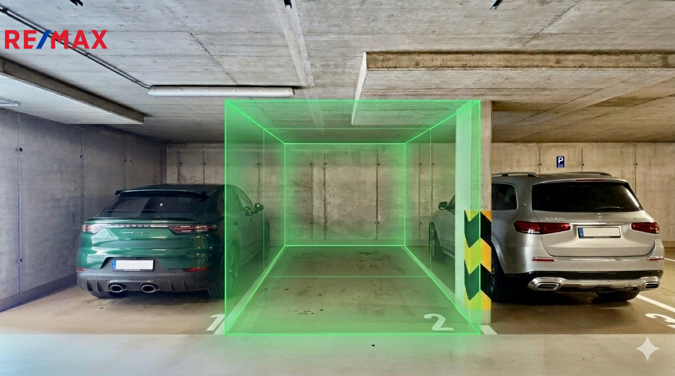 Prostor: Stání je strategicky umístěno tak, aby umožňovalo pohodlné parkování i pro větší vozy typu SUV (viz přiložená vizualizace).